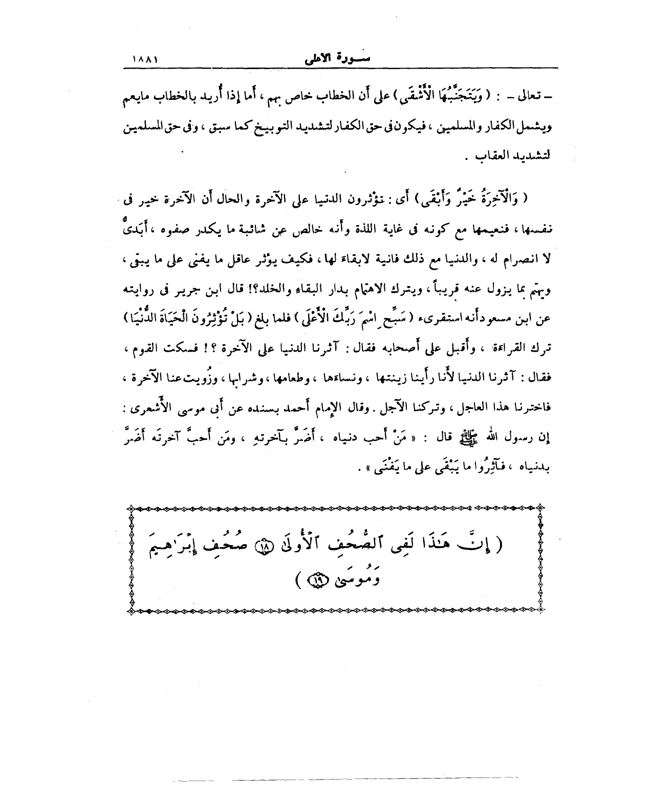 (وَالآخِرَةُ خَيْرٌ وَأَبْقَى) أَي: تؤْثرون الدنيا على الآخرة والحال أن الآخرة خير في نفسها، فتعيمها مع كونه في غاية اللذة وأَنه خالص عن شائبة ما يكدر صفوه، أَبَديٌّ لا انصرام له، والدنيا مع ذلك فانية لا بقاءَ لها، فكيف يؤْثر عاقل ما يفنى على ما يبقى، ويهتم بما يزول عنه قريبًا، ويترك الاهتمام بدار البقاءِ والخلد؟! قال ابن جرير في روايته عن ابن مسعود أَنه استقرئ (سَبِّحْ اسْمَ رَبِّكَ الأَعْلَى) فلما بلغ (بَلْ تُؤْثِرُونَ الْحَيَاةَ الدُّنْيَا) ترك القراءَة، وأَقبل على أَصحابه فقال: آثرنا الدنيا على الآخرة؟! فسكت القوم، فقال: آثرنا الدنيا رأَينا زينتها، ونساءَها، وطعامها، وشرابها، وزُويت عنا الآخرة، فاخترنا هذا العاجل، وتركنا الآجل. وقال الإِمام أحمد بسنده عن أَبي موسى الأَشعري: إِن رسول الله صلى الله عليه وسلم قال: "مَنْ أَحب دنياه، أَضَرَّ بآخرتهِ، ومَن أَحبَّ آخرتَه أَضَرَّ بدنياه، فآثِروا ما يَبْقَى على ما يَفْنَى".