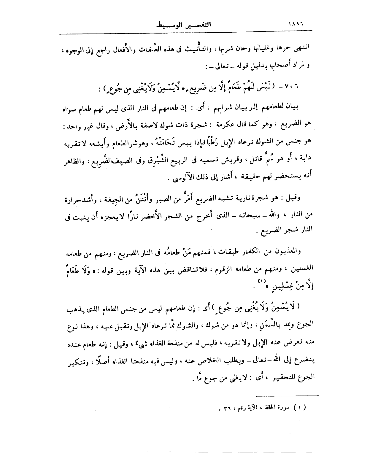 وقيل: هو شجرة نارية تشبه الضريع أَمَرُّ من الصبر وأَنْتَنُ من الجِيفة، وأَشد حرارة من النار، والله -سبحانه - الذي أَخرج من الشجر الأَخضر نارًا لا يعجزه أَن ينبت في النار شجر الضريع.