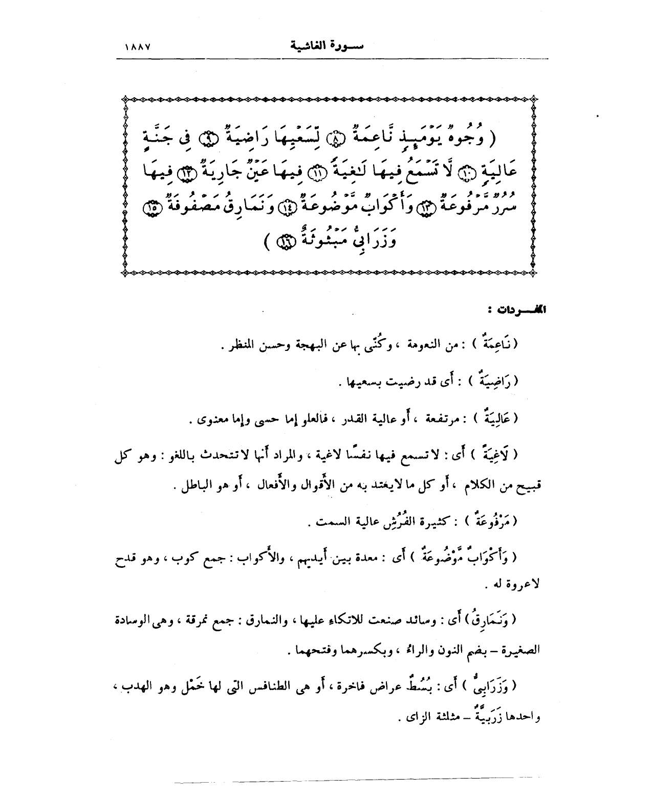 (لاغِيَةً) أَي: لا تسمع فيها نفسًا لاغية، والمراد أَنها لا تتحدث باللغو: وهو كل قبيح من الكلام، أَو كل ما لا يعتد به من الأَقوال والأَفعال، أَو هو الباطل.
