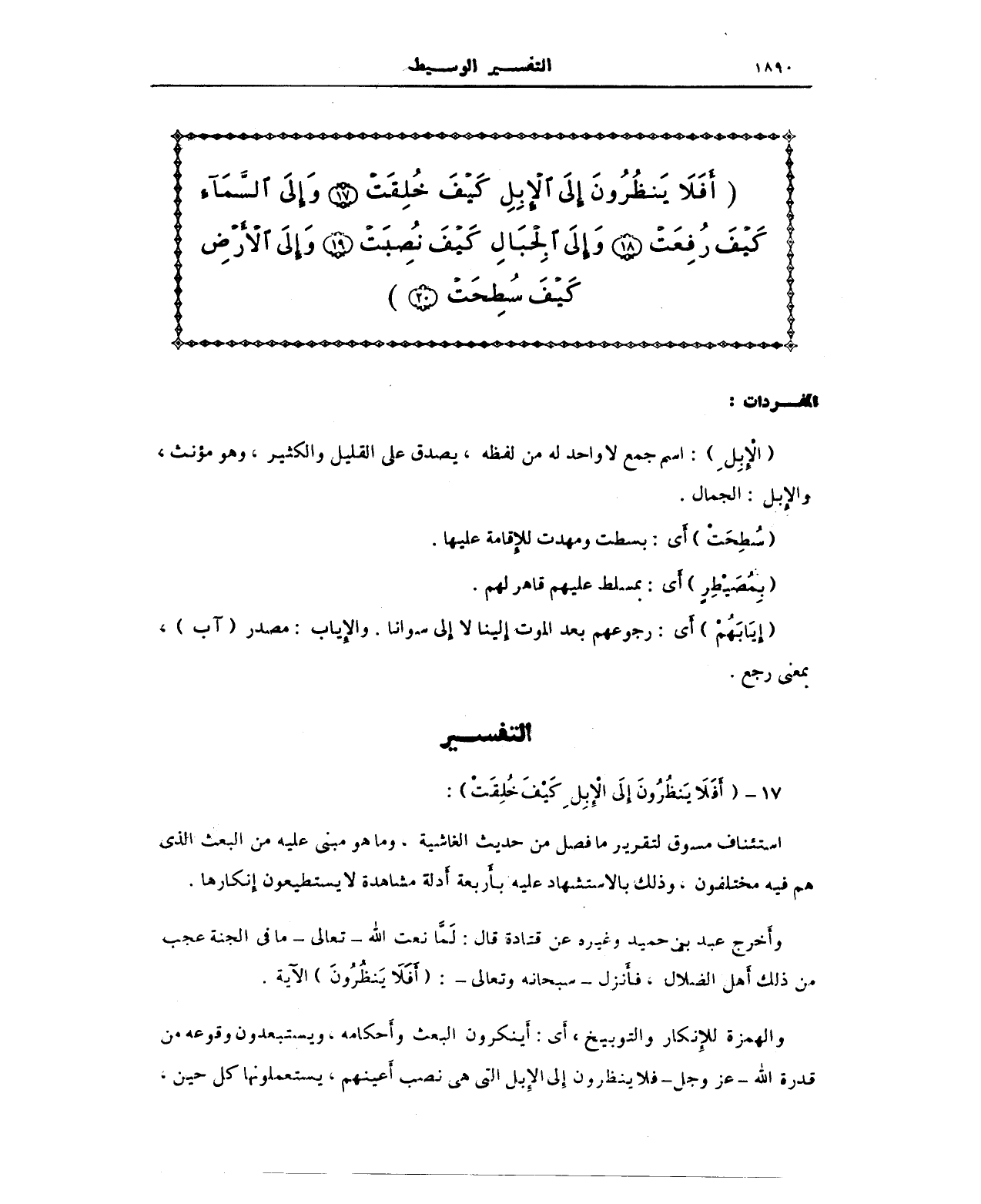 والهمزة للإِنكار والتوبيخ، أَي: أَينكرون البعث وأَحكامه, ويستبعدون وقوعه من قدرة الله عز وجل فلا ينظرون إِلى الإِبل التي هي نصب أَعينهم، يستعملونها كل حين،