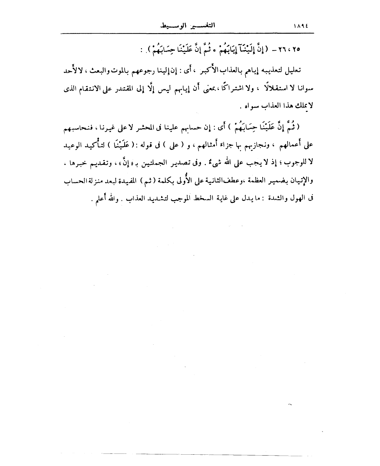 (ثُمَّ إِنَّ عَلَيْنَا حِسَابَهُمْ) أَي: إِن حسابهم علينا في المحشر لا على غيرنا، فنحاسبهم على أَعمالهم، ونجازيهم بها جزاءَ أَمثالهم، و (على) في قوله: (عَلَيْنَا) لتأْكيد الوعيد لا للوجوب؛ إِذ لا يجب على الله شيءٌ. وفي تصدير الجملتين بـ "إِنَّ"، وتقديم خبرها، والإِثيان بضمير العظمة، وعطف الثانية على الأُولى بكلمة (ثم) المفيدة لبعد منزلة الحساب في الهول والشدة: ما يدل على غاية السخط الموجب لتشديد العذاب. والله أعلم.