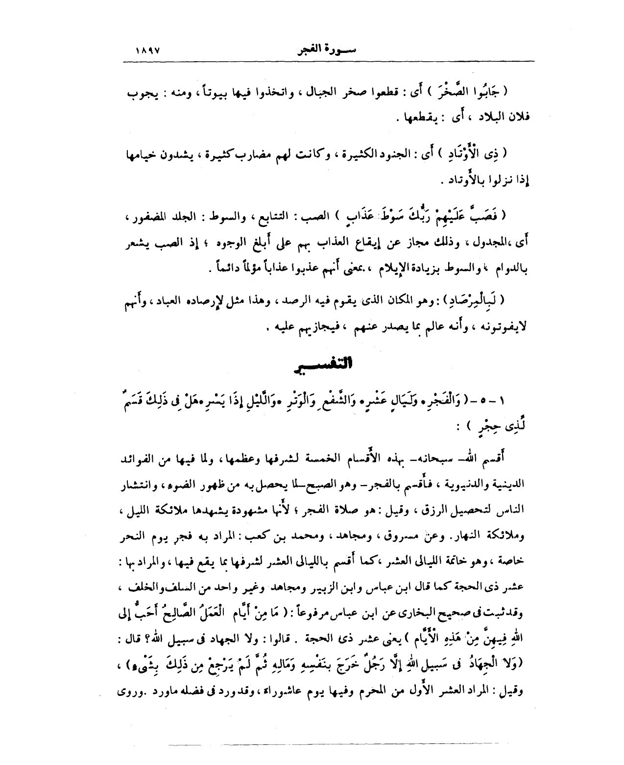 أَقسم الله -سبحانه- بهذه الأَقسام الخمسة لشرفها وعظمها، ولما فيها من الفوائد الدينية والدنوينة، فأَقسم بالفجر -وهو الصبح- لما يحصل به من ظهور الضوءِ، وانتشار الناس لتحصيل الرزق، وقيل: هو صلاة الفجر؛ لأَنها مشهودة يشهدها ملائكة الليل، وملائكة النهار، وعن مسروق، ومجاهد، ومحمد بن كعب: المراد به فجر يوم النحر خاصة، وهو خاتمة الليالي العشر، كما أَقسم بالليالي العشر لشرفها بما يقع فيها، والمراد بها: عشر ذي الحجة كما قال ابن عباس وابن الزبير ومجاهد وغير واحد من السلف والخلف، وقد ثبت في صحيح البخاري عن ابن عباس مرفوعًا: "مَا مِنْ أَيَّام الْعَمَلُ الصَّالِحُ أَحَبُّ إِلى الله فِيهِنَّ مِنْ هَذِهِ الْأَيَّام) يعني عشر ذي الحجة. قالوا: ولا الجهاد في سبيل الله؟ قال: (وَلاَ الْجِهَادُ فِي سَبيل الله إِلاَّ رَجُلٌ خَرَجَ بنَفْسَهِ وَمَالِهِ ثُمَّ لَمْ يَرْجِعْ مِن ذَلِكَ بِشَيْءٍ)، وقيل: المراد العشر الأَول من المحرم وفيها يوم عاشوراء، وقد ورد في فضله ما ورد. وروي