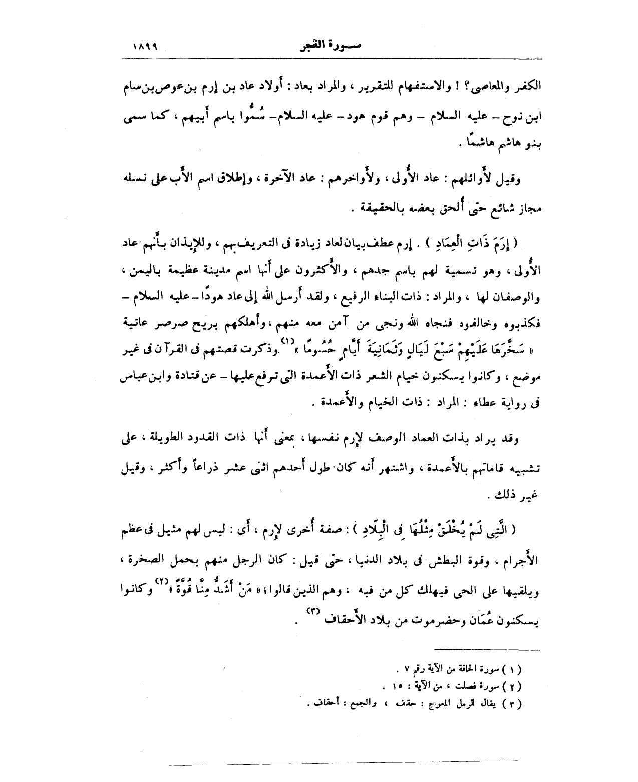 (إِرَمَ ذَاتِ الْعِمَادِ): إِرم عطف بيان لعاد زيادة في التعريف بهم، وللإِيذان بأَنهم عاد الأُولى، وهو تسمية لهم باسم جدهم، والأَكثرون على أَنها اسم مدينة عظيمة باليمن، والوصفان لها، والمراد: ذات البناءِ الرفيع، ولقد أَرسل الله إِلى عاد هودًا - عليه السلام - فكذبوه وخالفوه فنجاه الله ونجى من آمن معه منهم، وأَهلكهم بريح صرصر عاتية "سَخَّرَهَا عَلَيْهِمْ سَبْعَ لَيَالٍ وَثَمَانِيَةَ أَيَّامٍ حُسُومًا" (¬1) وذكرت قصتهم في القرآن في غير موضع، وكانوا يسكنون خيام الشعر ذات الأَعمدة التي ترفع عليها -عن قتادة وابن عباس في رواية عطاءِ: المراد: ذات الخيام والأَعمدة.