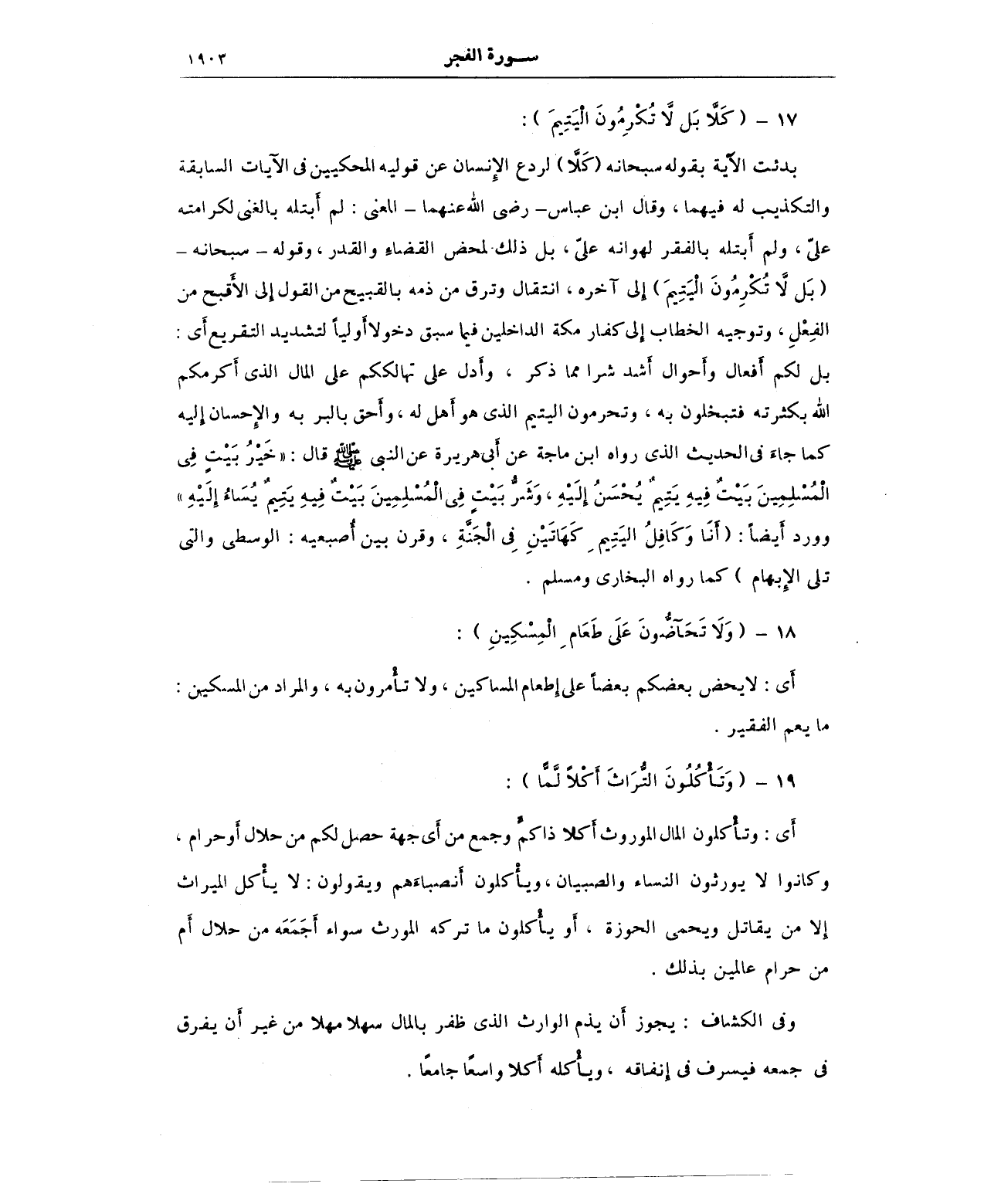 بدئت الآية بقوله سبحانه (كَلاَّ) لردع الإِنسان عن قوليه المحكيين في الآيات السابقة والتكذيب له فيهما، وقال ابن عباس - رضي الله عنهما - المعنى: لم أَبتله بالغنى لكرامته عليّ، ولم أَبتله بالفقر لهوانه عليّ، بل ذلك لمحض القضاءِ والقدر، قوله -سبحانه- (بَل لا تُكْرِمُونَ الْيَتِيمَ) إِلى آخره، انتقال وترق من ذمه بالقبيح من القول إِلى الأَقبح من الفِعْلِ، وتوجيه الخطاب إِلى كفار مكة الداخلين فيما سبق دخولا أَوليًا لتشديد التقريع أَي: بل لكم أَفعال وأَحوال أَشد شرًا مما ذكر، وأَدل على تهالككم على المال الذي أَكرمكم الله بكثرته فتبخلون به، وتحرمون اليتيم الذي هو أَهل له، وأَحق بالبر به والإِحسان إليه كما جاءَ في الحديث الذي رواه ابن ماجة عن أَبي هريرة عن النبي صلى الله عليه وسلم قال: "خَيْرُ بَيْتٍ فِي الْمُسْلِمِينَ بَيْتٌ فِيهِ يَتَيمٌ يُحْسَنُ إِلَيْهِ، وَشَرُّ بَيْتٍ فِي الْمُسْلِمِينَ بَيْتٌ فِيهِ يتَيِمٌ يُسَاءُ إِلَيْهِ" وورد أَيضًا: (أَنَا وَكَافِلُ اليَتيمِ كَهَاتَيْنِ فِي الْجَنَّةِ، وقرن بين أُصبعيه: الوسطى والتي تلي الإِبهام) كما رواه البخاري ومسلم.