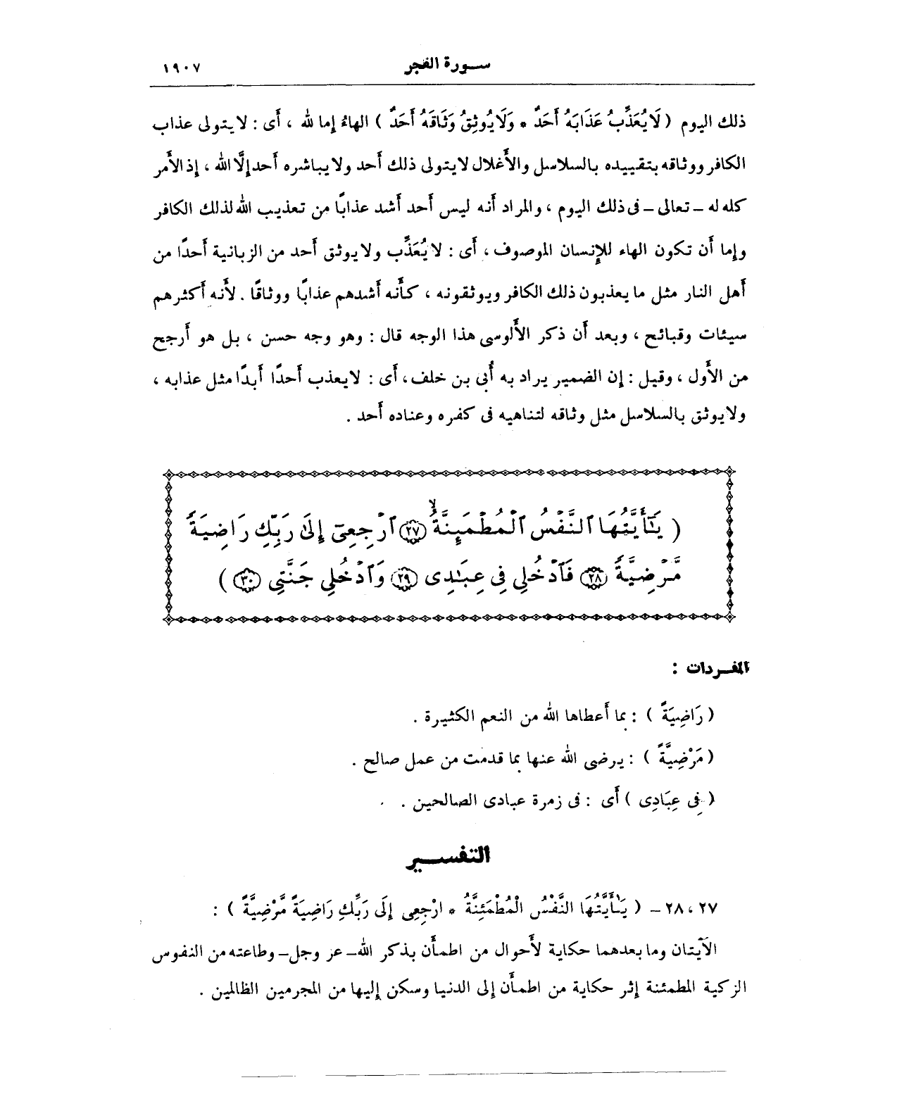 ذلك اليوم (لا يُعَذِّبُ عَذَابَهُ أَحَدٌ * وَلا يُوثِقُ وَثَاقَهُ أَحَدٌ) الهاءُ إِما لله، أَي: لا يتولى عذاب الكافر ووثاقه بتقييده بالسلاسل والأَغلال لا يتولى ذلك أَحد ولا يباشره أَحد إِلاَّ الله، إِذ الأَمر كله له - تعالى - في ذلك اليوم، والمراد أَنه ليس أَحد أَشد عذابًا من تعذيب الله لذلك الكافر وإِما أَن تكون الهاء للإِنسان الموصوف، أَي: لا يُعَذَّب ولا يوثق أَحد من الزبانية أَحدًا من أَهل النار مثل ما يعذبون ذلك الكافر ويوثقونه، كأَنه أَشدهم عذابًا ووثاقًا. لأَنه أَكثرهم سيئات وقبائح، وبعد أَن ذكر الأَلوسي هذا الوجه قال: وهو وجه حسن، بل هو أَرجح من الأَول، وقيل: إِن الضمير يراد به أُبي بن خلف، أَي: لا يعذب أَحدًا أَبدًا مثل عذابه، ولا يوثق بالسلاسل مثل وثاقه لتناهيه في كفره وعناده أَحد.