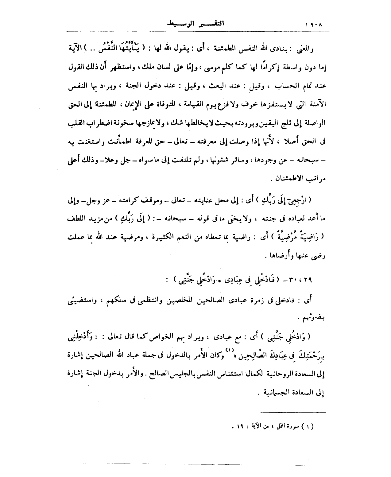 والمعنى: ينادي الله النفس المطمئنة، أَي: يقول الله لها (يَا أَيَّتُهَا النَّفْسُ) الآية إِما دون واسطة إِكرامًا لها كما كلم موسى، وإِمَّا على لسان ملك، واستظهر أَن ذلك القول عند تمام الحساب، وقيل: عند البعث، وقيل: عند دخول الجنة، ويراد بها النفس الآمنة التي لا يستفزها خوف ولا فزع يوم القيامة، المتوفاة على الإِيمان، المطمئنة إِلى الحق الواصلة إِلى ثلج اليقين وبرودته بحيث لا يخالطها شك، ولا يمازجها سخونة اضطرب القلب في الحق أَصلا، لأَنها إِذا وصلت إِلى معرفته - تعالى - حق المعرفةى اطمأَنت واستغنت به -سبحانه- عن وجودها، وسائر شئونها، ولم تلتفت إِلى ما سواه - جل وعلا - وذلك أَعلى مراتب الاطمئنان.