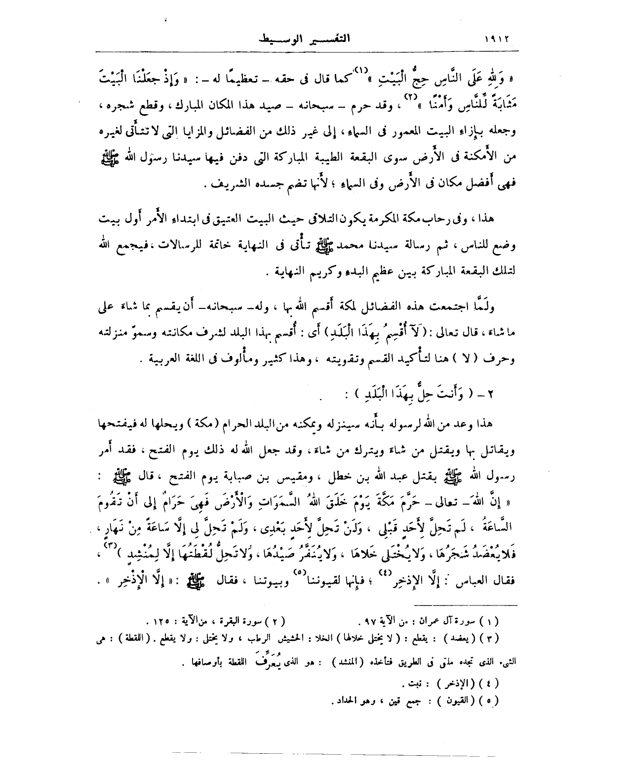 هذا وعد من الله لرسوله بأَنه سينزله ويمكنه من البلد الحرام (مكة) ويحلها له فيفتحها ويقاتل بها ويقتل من شاءَ ويترك من شاءَ، وقد جعل الله له ذلك يوم الفتح، فقد أَمر رسول الله صلى الله عليه وسلم بقتل عبد الله بن خطل، ومقيس بن صبابة يوم الفتح، قال صلى الله عليه وسلم: "إِنَّ الله - تعالى - حَرَّمَ مَكَّةَ يَوْمَ خَلَقَ اللهُ السَّمَاوَات وَالْأَرْضَ فَهِيَ حَرَامٌ إِلى أَنْ تَقُومَ السَّاعَةُ، لَم تَحِلَّ لأَحَدٍ قَبْليِ، وَلَنْ تَحِلَّ لأَحَدٍ بَعْدِي، وَلَمْ تَحِلَّ لِي إِلاَّ سَاعَةً مِنْ نَهَارٍ، فَلا يُعْضَدُ شَجَرُهَا، وَلا يُخْتَلى خَلاهَا، وَلا يُنَفَّرُ صَيْدُهَا، وَلا تَحِلُّ لُقْطَتُهَا إِلاَّ لِمُنْشِدٍ" (¬3)، فقال العباس: إِلاَّ الإِذخِر (¬4)؛ فإِنها لقيوننا (¬5) وبيوتنا، فقال رسول الله صلى الله عليه وسلم: "إِلاَّ الْإِذْخِر".