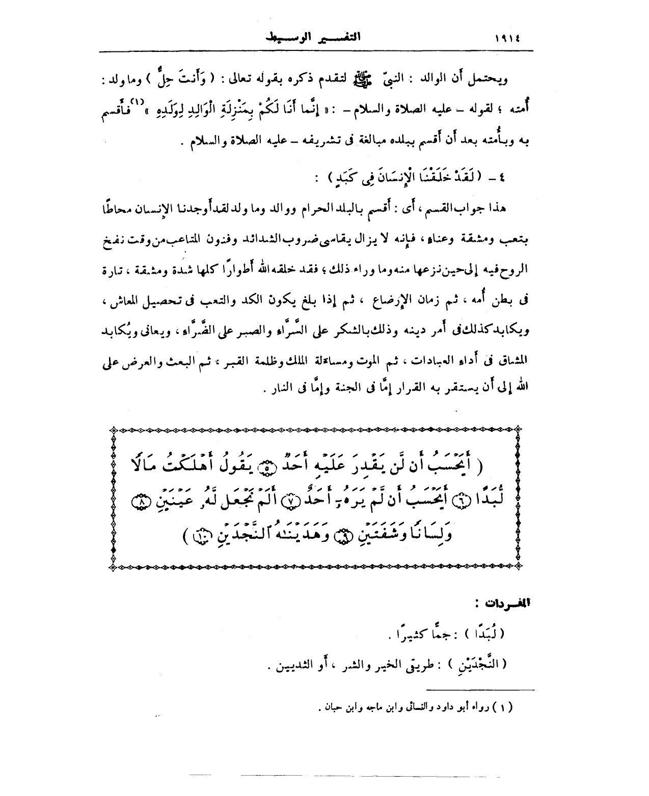 (أَيَحْسَبُ أَنْ لَنْ يَقْدِرَ عَلَيْهِ أَحَدٌ (5) يَقُولُ أَهْلَكْتُ مَالًا لُبَدًا (6) أَيَحْسَبُ أَنْ لَمْ يَرَهُ أَحَدٌ (7) أَلَمْ نَجْعَلْ لَهُ عَيْنَيْنِ (8) وَلِسَانًا وَشَفَتَيْنِ (9) وَهَدَيْنَاهُ النَّجْدَيْنِ (10))