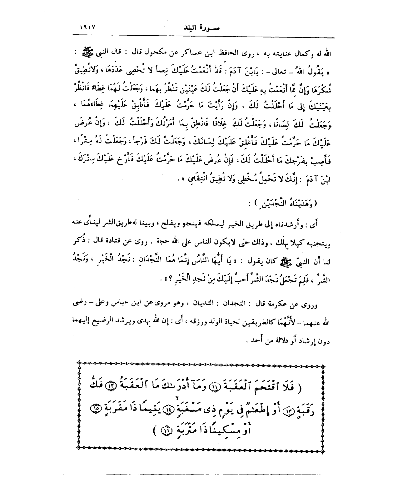 أَي: وأَرشدناه إِلى طريق الخير ليسلكه فينجو ويفلح، وبينا له طريق الشر لينأَى عنه ويتجنبه كيلا يهلك، وذلك حتى لا يكون للناس على الله حجة. روي عن قتادة قال: ذُكر لنا أَن النبي صلى الله عليه وسلم كان يقول: "يَا أَيُّهَا النَّاسُ إِنَّمَا هُمَا النَّجْدانِ: نَجْدُ الْخَيْرِ، ونَجْدُ الشَّرِّ، فَلِمَ تَجْعَلُ نَجْدَ الشَّرِّ أَحبَّ إِليْكَ مِنْ نَجِدِ الْخَيْرِ؟ ".