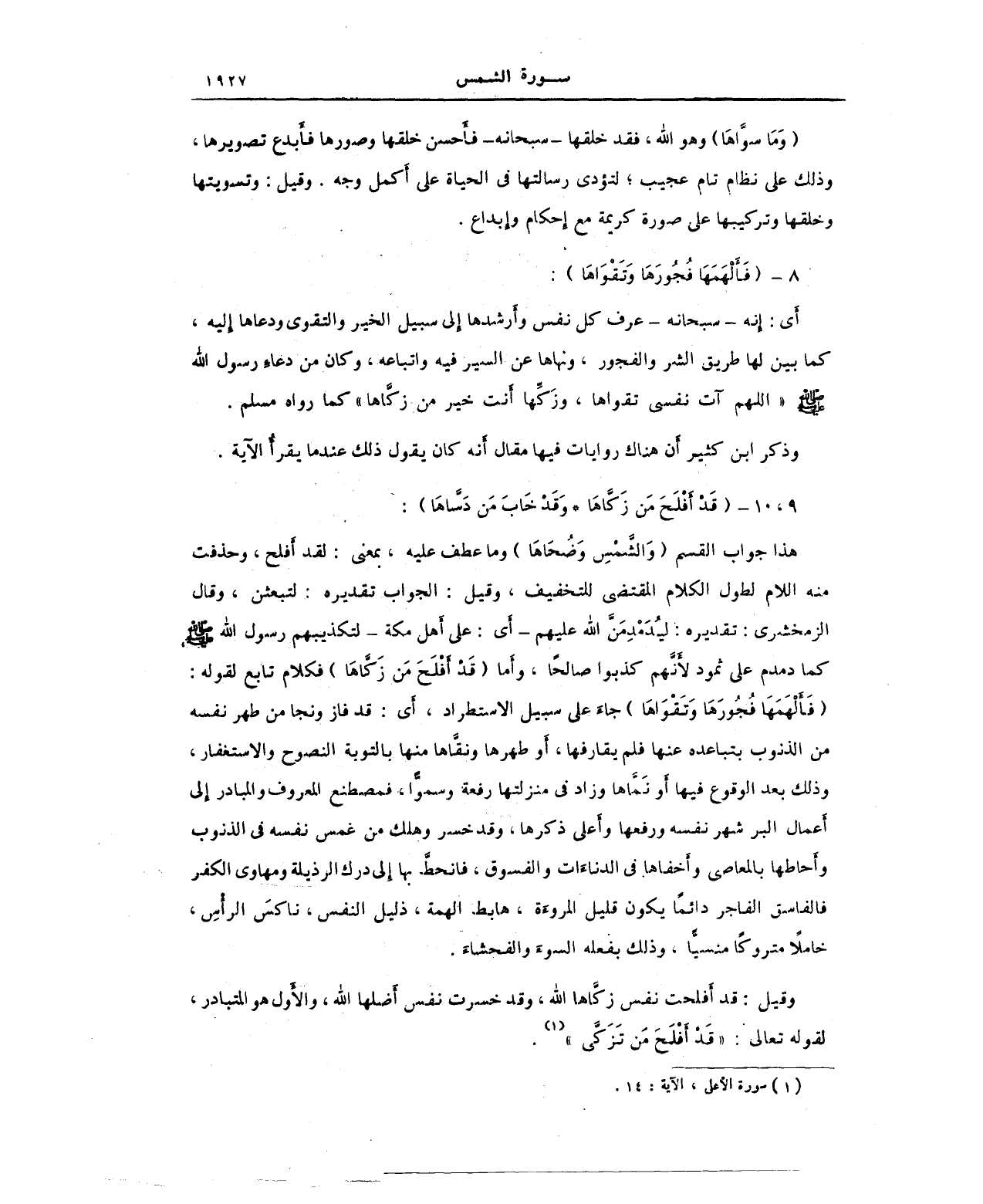 وقيل: قد أَفلحت نفس زكَّاها الله، وقد خسرت نفس أَضلها الله، والأَول هو المتبادر، لقوله تعالى: "قَدْ أَفْلَحَ مَنْ تَزَكَّى" (¬1)