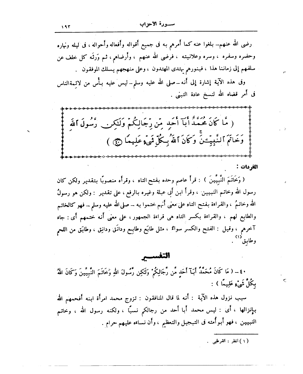 {مَا كَانَ مُحَمَّدٌ أَبَا أَحَدٍ مِنْ رِجَالِكُمْ وَلَكِنْ رَسُولَ اللَّهِ وَخَاتَمَ النَّبِيِّينَ وَكَانَ اللَّهُ بِكُلِّ شَيْءٍ عَلِيمًا (40)}