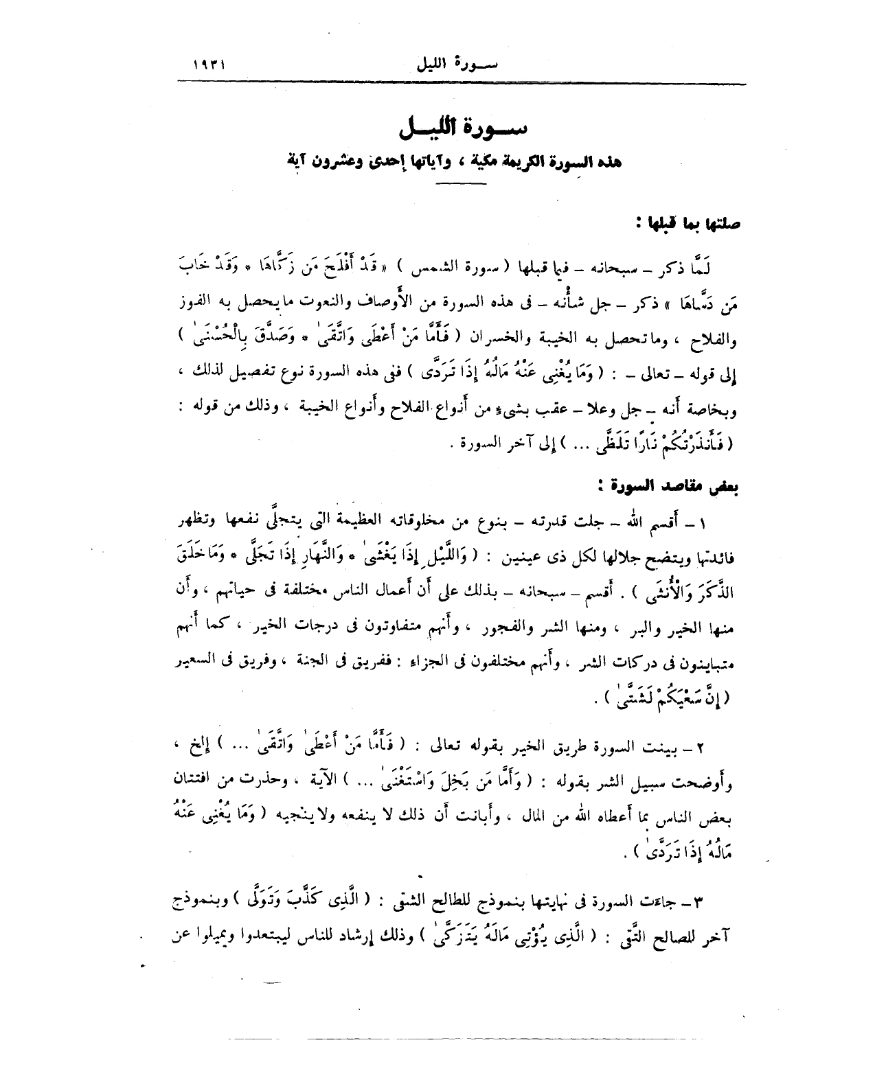 1 - أَقسم الله -جلت قدرته- بنوع من مخلوقاته العظيمة التي يتجلَّى نفعها وتظهر فائدتها ويتضح جلالها لكل ذي عينين: (وَاللَّيْلِ إِذَا يَغْشَى * وَالنَّهَارِ إِذَا تَجَلَّى * وَمَا خَلَقَ الذَّكَرَ وَالأُنْثَى). أَقسم سبحانه بذلك على أَن أَعمال الناس مختلفة في حياتهم، وأَن منها الخير والبر، ومنها الشر والفجور، وأنهم متفاوتون في درجات الخير، كما أَنهم متباينون في دركات الشر، وأَنهم مختلفون في الجزاءِ: ففريق في الجنة، وفريق في السعير (إِنَّ سَعْيَكُمْ لَشَتَّى).