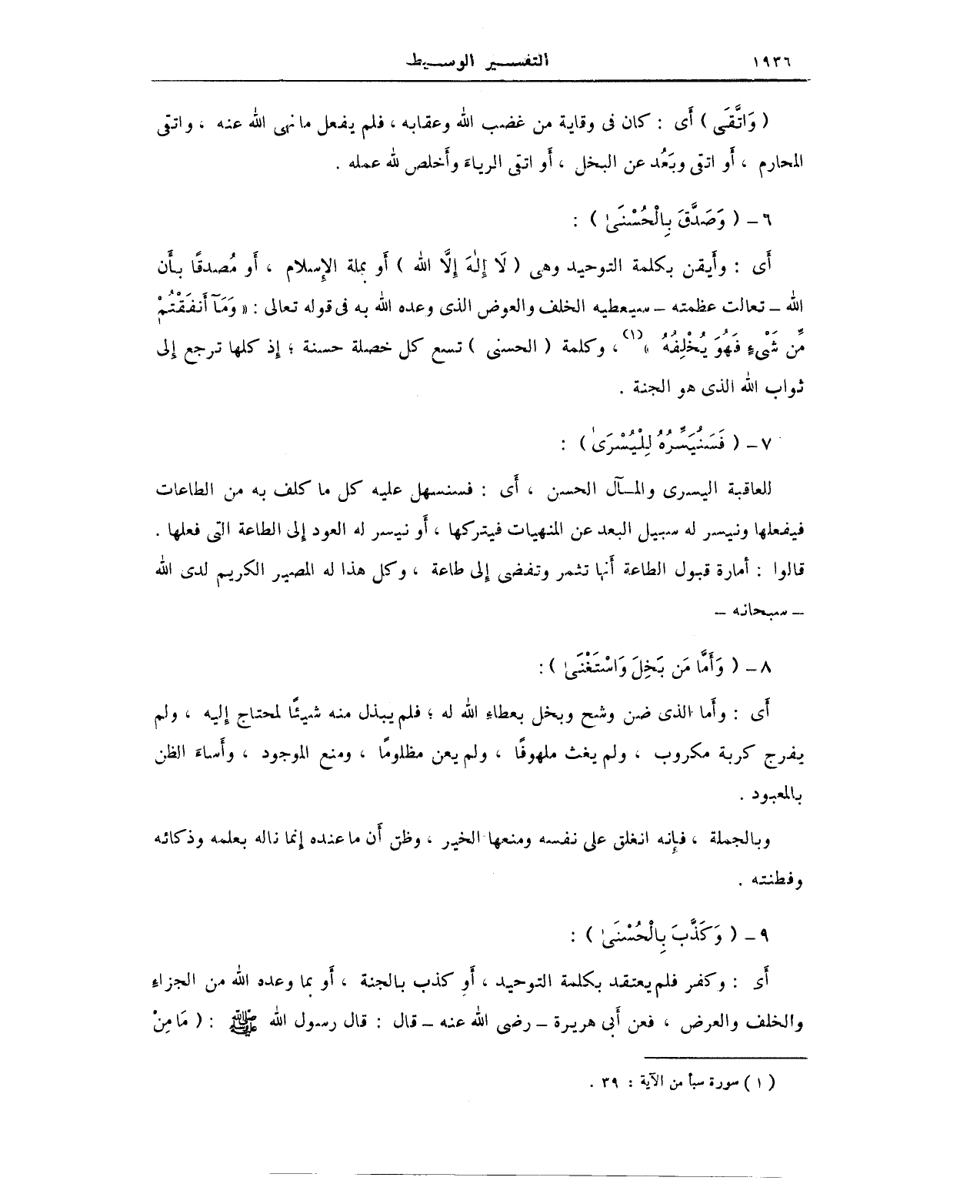 أَي: وأَيقن بكلمة التوحيد وهي (لا إِله إِلا الله) أَو بملة الإِسلام، أَو مصدقًا بأَن الله -تعالت عظمته- سيعطيه الخلف والعوض الذي وعده الله به في قوله تعالى: "وَمَا أَنفَقْتُمْ مِنْ شَيْءٍ فَهُوَ يُخْلِفُهُ" (¬1) وكلمة (الحسنى) تسع كل خصلة حسنة؛ إِذ كلها ترجع إِلى ثواب الله الذي هو الجنة.