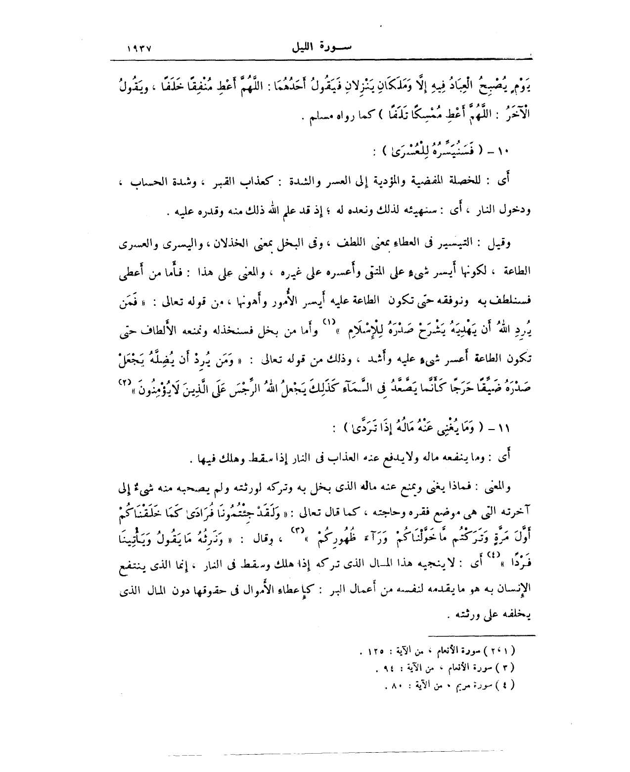 وقيل: التيسير في العطاءِ بمعنى اللطف، وفي البخل بمعنى الخذلان، واليسرى والعسرى الطاعة، لكونها أَيسر شيءٍ على المتقي وأَعسره على غيره، والمعنى على هذا: فأَما من أَعطى فسنلطف به ونوفقه حتى تكون الطاعة عليه أَيسر الأُمور وأَهوانها، من قوله تعالى: "فَمَنْ يُرِدْ اللَّهُ أَنْ يَهدِيَهُ يَشْرَحْ صَدْرَهُ لِلإِسْلامِ" (¬1) وأَما من بخل فسنخذله ونمنعه الأَلطاف حتى تكون الطاعة أَعسر شيءٍ عليه وأَشد، وذلك من قوله تعالى: "وَمَنْ يُرِدْ أَنْ يُضِلَّهُ يَجْعَلْ صَدْرَهُ ضَيِّقًا حَرَجًا ك أَنَّمَا يَصَّعَّدُ فِي السَّمَاءِ كَذَلِكَ يَجْعَلُ اللَّهُ الرِّجْسَ عَلَى الَّذِينَ لا يُؤْمِنُونَ" (¬2).