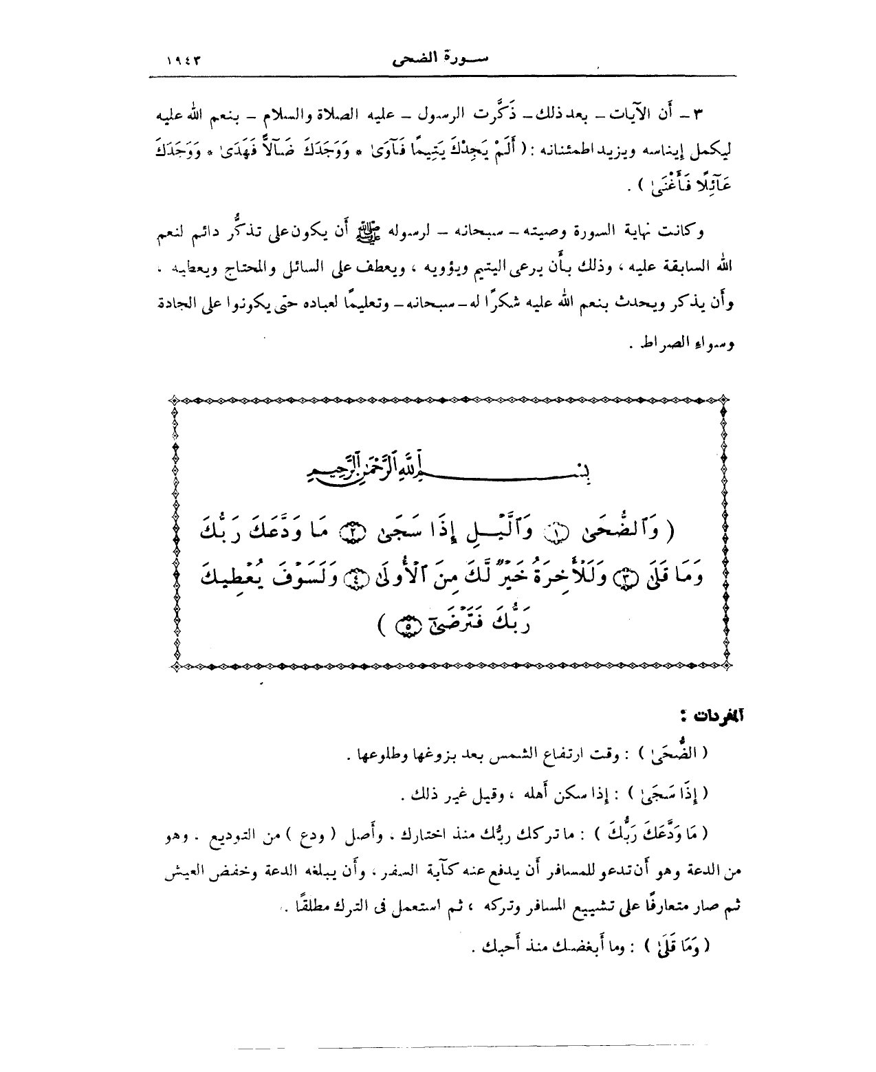 (وَالضُّحَى (1) وَاللَّيْلِ إِذَا سَجَى (2) مَا وَدَّعَكَ رَبُّكَ وَمَا قَلَى (3) وَلَلآخِرَةُ خَيْرٌ لَكَ مِنْ الأُولَى (4) وَلَسَوْفَ يُعْطِيكَ رَبُّكَ فَتَرْضَى (5))