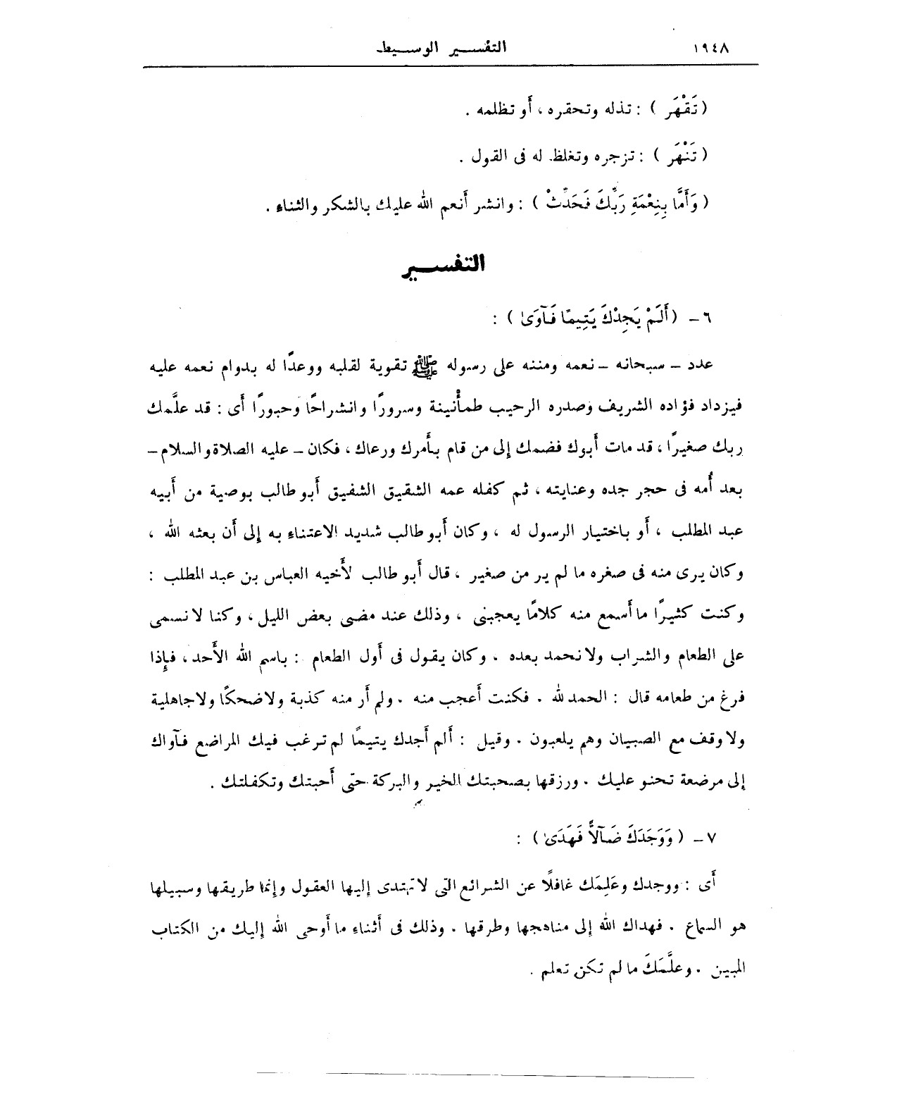 عدد -سبحانه- نعمه ومننه على رسوله صلى الله عليه وسلم تقوية لقلبه ووعدًا له بدوام نعمه عليه فيزداد فؤاده الشريف وصدره الرحيب طمأْنينة وسرورًا وانشراحًا وحبورًا أَي: قد علَّمك ربك صغيرًا، قد مات أَبوك فضمك إلى من قام بأَمرك ورعاك، فكان -عليه الصلاة والسلام - بعد أُمه في حجر جده وعنايته، ثم كفله عمه الشقيق الشفيق أبو طالب بوصية من أَبيه عبد المطلب، أَو باختبار الرسول له، وكان أَبو طالب شديد الاعتناءِ به إِلى أَن بعثه الله، وكان يرى منه في صغره ما لم ير من صغير، قال أَبو طالب لأَخيه العباس بن عبد المطلب: وكنت كثيرًا ما أَسمع منه كلامًا يعجبني، وذلك عند مضي بعض الليل، وكنا لا نسمي على الطعام والشراب ولا نحمد بعده، وكان يقول في أَول الطعام: باسم الله الأَحد، فإِذا فرغ من طعامه قال: الحمد لله، فكنت أَعجب منه، ولم أر منه كذبة ولا ضحكًا ولا جاهلية ولا وقف مع الصبيان وهم يلعبون، وقيل: أَلم أَجدك يتيمًا لم ترغب فيك المراضع فآواك إلى مرضعة تحنو عليك، ورزقها بصحبتك الخير والبركة حتى أَحبتك وتكفلتك.