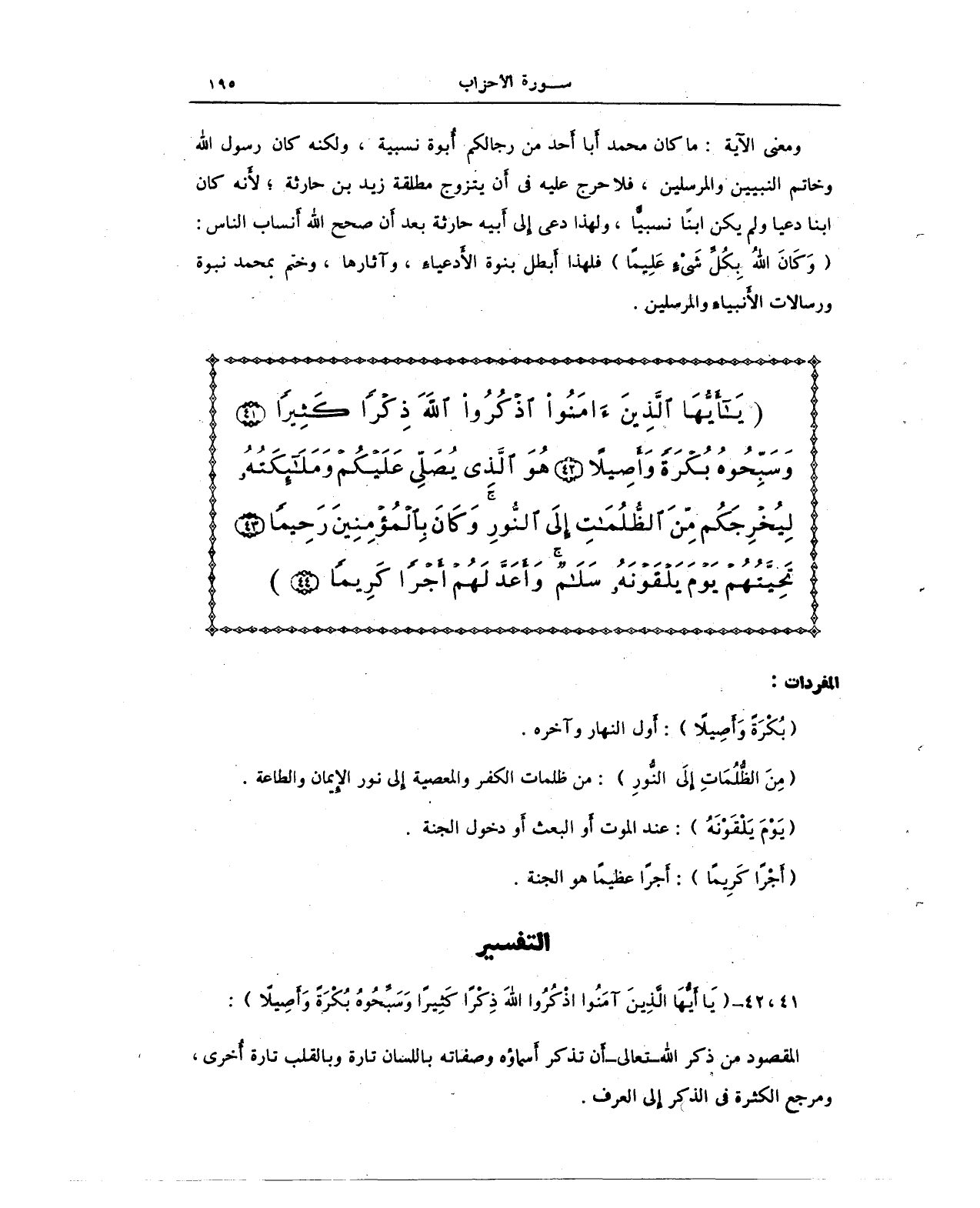 {يَا أَيُّهَا الَّذِينَ آمَنُوا اذْكُرُوا اللَّهَ ذِكْرًا كَثِيرًا (41) وَسَبِّحُوهُ بُكْرَةً وَأَصِيلًا (42) هُوَ الَّذِي يُصَلِّي عَلَيْكُمْ وَمَلَائِكَتُهُ لِيُخْرِجَكُمْ مِنَ الظُّلُمَاتِ إِلَى النُّورِ وَكَانَ بِالْمُؤْمِنِينَ رَحِيمًا (43) تَحِيَّتُهُمْ يَوْمَ يَلْقَوْنَهُ سَلَامٌ وَأَعَدَّ لَهُمْ أَجْرًا كَرِيمًا (44)}