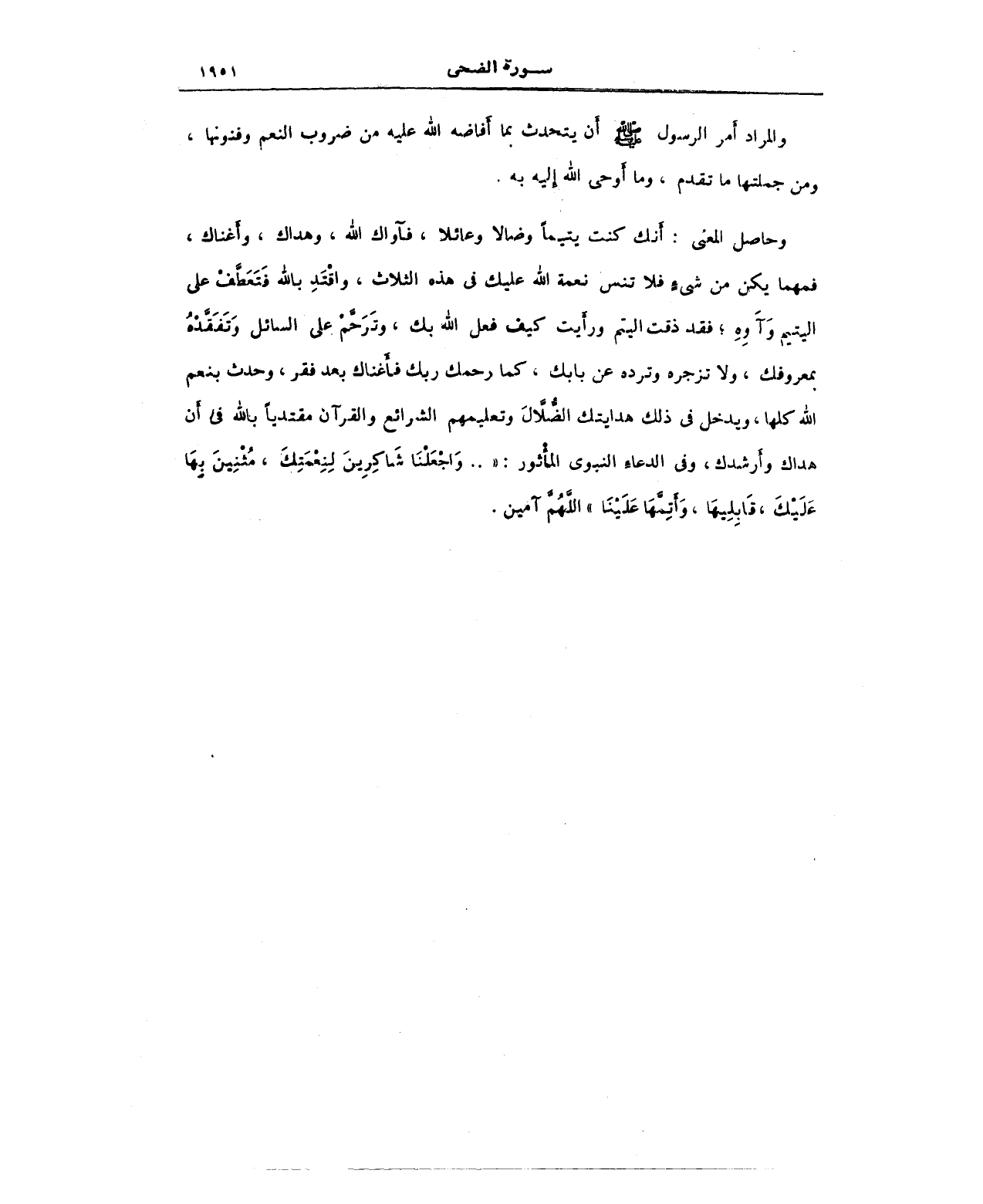 وحاصل المعنى: أَنك كنت يتيمًا وضالا وعائلا، فآواك الله، وهداك، وأَغناك، فمهما يكن من شيءٍ فلا تنس نعمة الله عليك في هذه الثلاث، واقْتَدِ بالله فَتَعَطَّفْ على اليتيم وَآوِهِ؛ فقد ذقت اليتم ورأَيت كيف فعل الله بك، وتَرَحَّمْ على السائل وَتَفَقَّدْهُ بمعروفك، ولا تزجره وترده عن بابك، كما رحمك ربك فأَغناك بعد فقر، وحدث بنعم الله كلها، ويدخل في ذلك هدايتك الضُّلاَّلَ وتعليمهم الشرائع والقرآن مقتديًا بالله في أَن هداك وأَرشدك، وفي الدعاءِ النبوي المأْثور: " ... وَاجْعَلْنَا شَاكِرِينَ لِنِعْمَتِك، مُثْنِينَ بِهَا عَلَيْك، قَابِلِيهَا، وأَتِمَّهَا عَلَيْنَا" اللهم آمين.