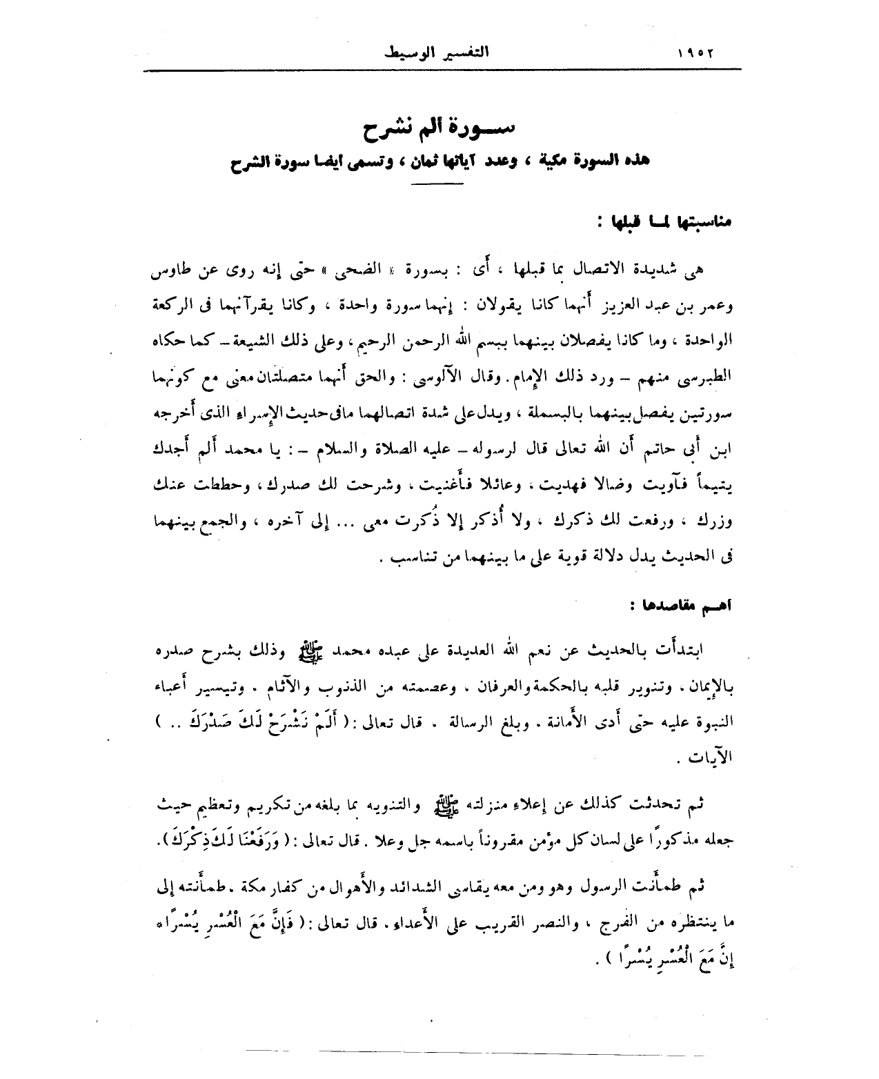 هي شديدة الاتصال بما قبلها، أَي: بسورة "الضحى" حتى إِنه روي عن طاوس وعمر بن عبد العزيز أَنهما كانا يقولان: إِنهما سورة واحدة، وكانا يقرآنهما في الركعة الواحدة، وما كانا يفصلان بينهما ببسم الله الرحمن الرحيم، وعلى ذلك الشيعة -كما حكاه الطبرسي منهم- ورد ذلك الإِمام. وقال الآلوسي: والحق أَنهما متصلتان معنى مع كونهما سورتين يفصل بينهما بالبسملة، ويدل على شدة اتصالهما ما في حديث الإِسراءِ الذي أَخرجه ابن أَبي حاتم أَن الله تعالى قال لرسوله -عليه الصلاة والسلام-: يا محمد أَلم أَجدك يتيمًا فآويت وضالا فهديت، وعائلا فأَغنيت، وشرحت لك صدرك، حططت عنك وزرك، ورفعت لك ذكرك، ولا أُذكر إِلا ذُكرت معي .. إِلى آخره، والجمع بينهما في الحديث يدل دلالة قوية على ما بينهما من تناسب.