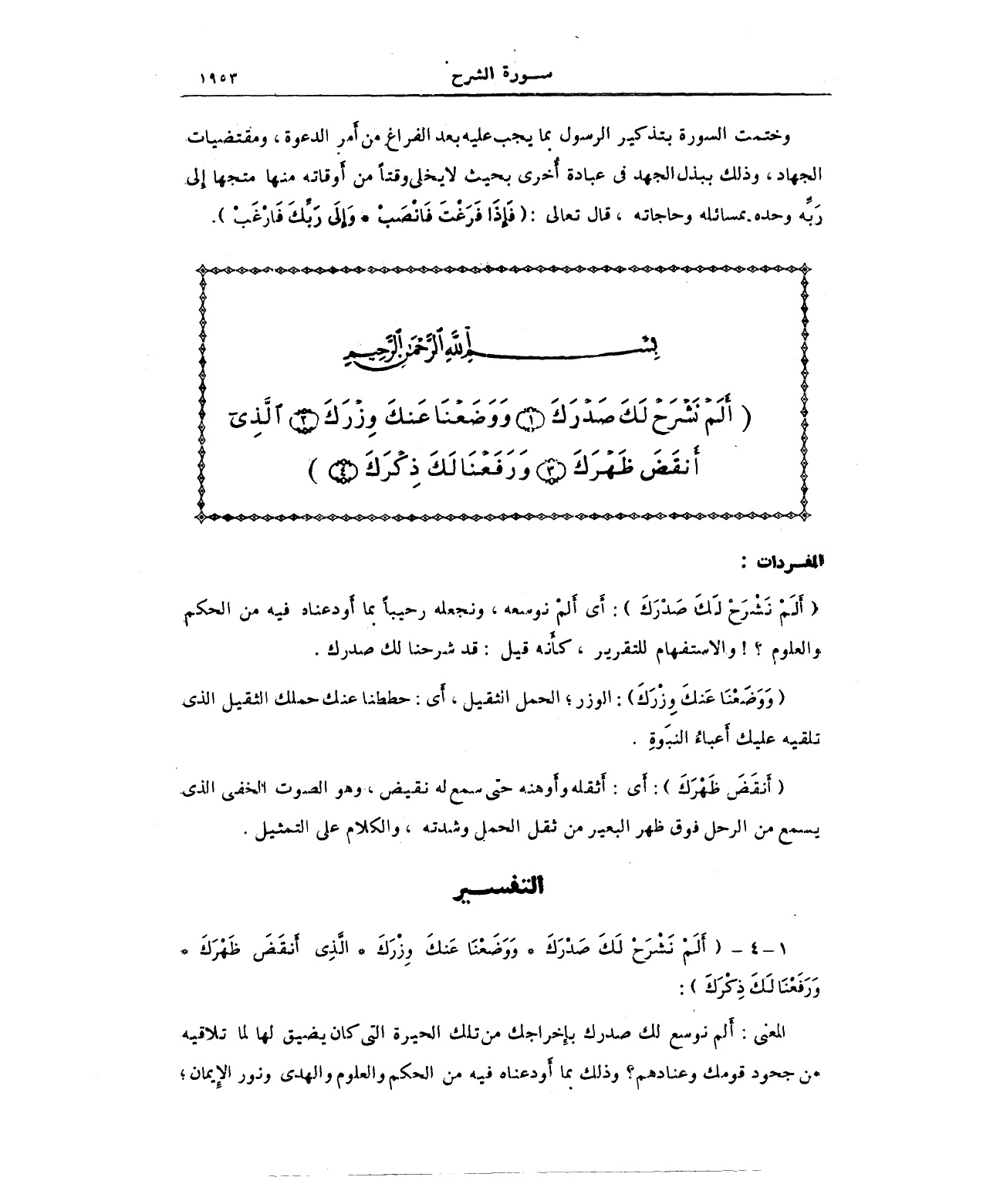 (أَلَمْ نَشْرَحْ لَكَ صَدْرَكَ (1) وَوَضَعْنَا عَنكَ وِزْرَكَ (2) الَّذِي أَنقَضَ ظَهْرَكَ (3) وَرَفَعْنَا لَكَ ذِكْرَكَ (4))