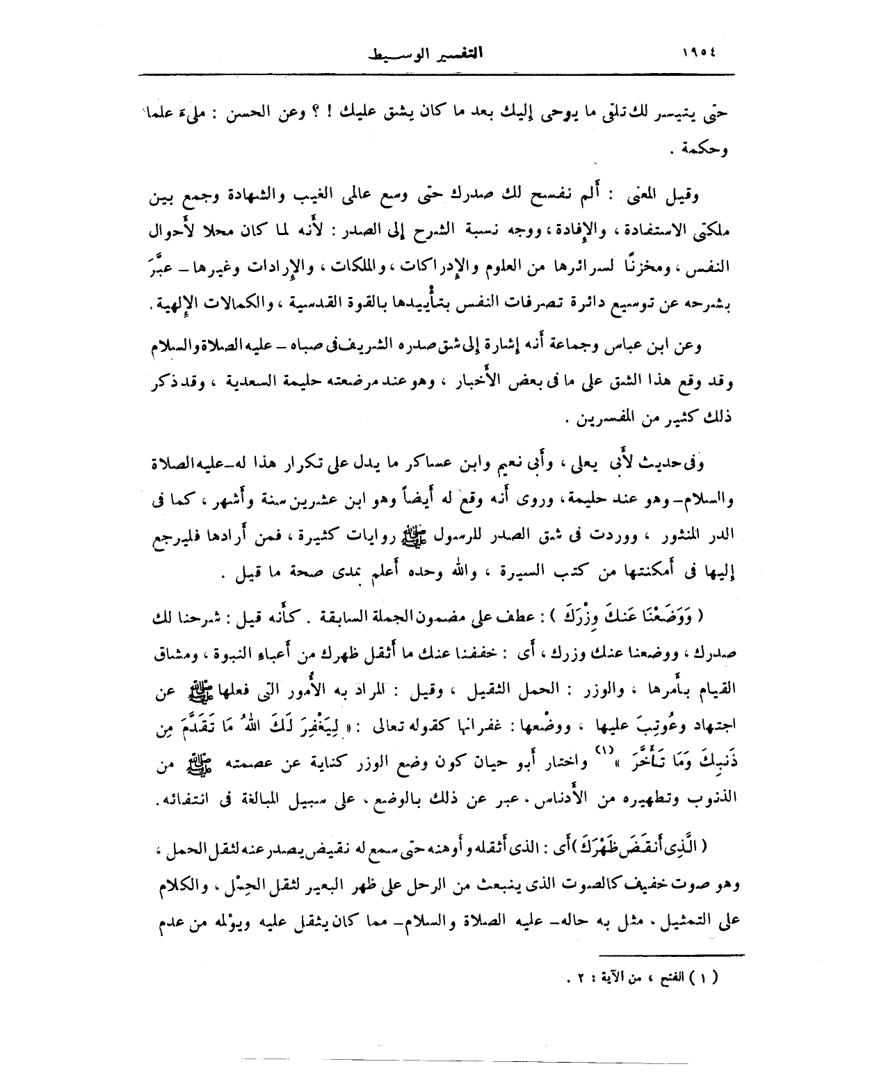 وقيل المعنى: أَلم نفسح لك صدرك حتى وسع عالمي الغيب والشهادة وجمع بين ملكتي الاستفادة، والإفادة، ووجه نسبة الشرح إِلى الصدر: لأَنه لما كان محلا لأَحوال النفس، ومخزنًا لسرائرها من العلوم والإِدراكات، والملكات، والإِرادات وغيرها -عبَّر بشرحه عن توسيع دائرة تصرفات النفس بتأييدها بالقوة القدسية، والكمالات الإِلهية.