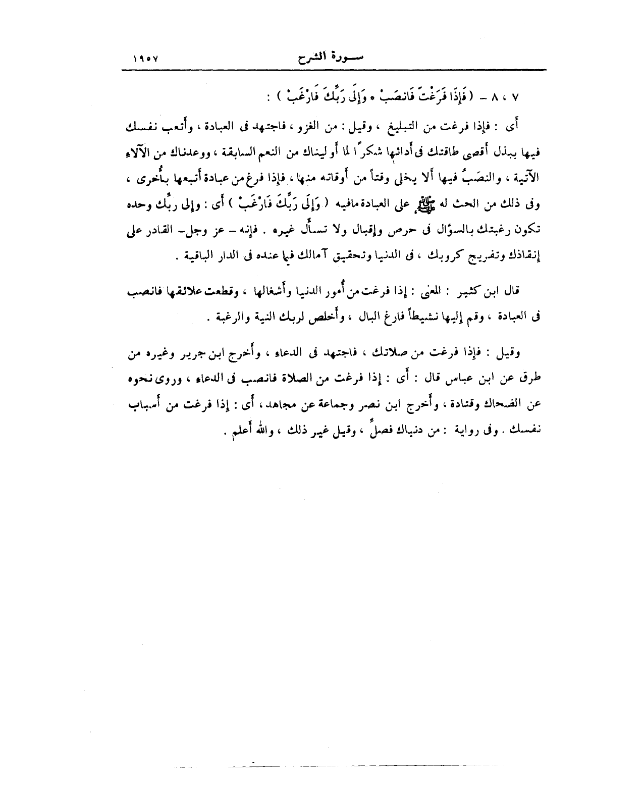 أَي: فإِذا فرغت من التبليغ، وقيل: من الغزو، فاجتهد في العبادة، وأَتعب نفسك فيها ببذل أَقصى طاقتك في أَدائها شكرًا لما أوليناك من النعم السابقة، ووعدناك من الآلاءِ الآتية، والنصَبُ فيها ألا يخلى وقتًا من أَوقاته منها، فإِذا فرغ من عبادة أَتبعها بأُخرى، وفي ذلك من الحث له صلى الله عليه وسلم على العبادة ما فيه (وَإِلَى رَبِّكَ فَارْغَبْ) أَي: وإِلى ربِّك وحده تكون رغبتك بالسؤال في حرص وإِقبال ولا تسأَل غيره. فإِنه عز وجل القادر على إِنقاذك وتفريج كروبك، في الدنيا وتحقيق آمالك فيما عنده في الدار الباقية.