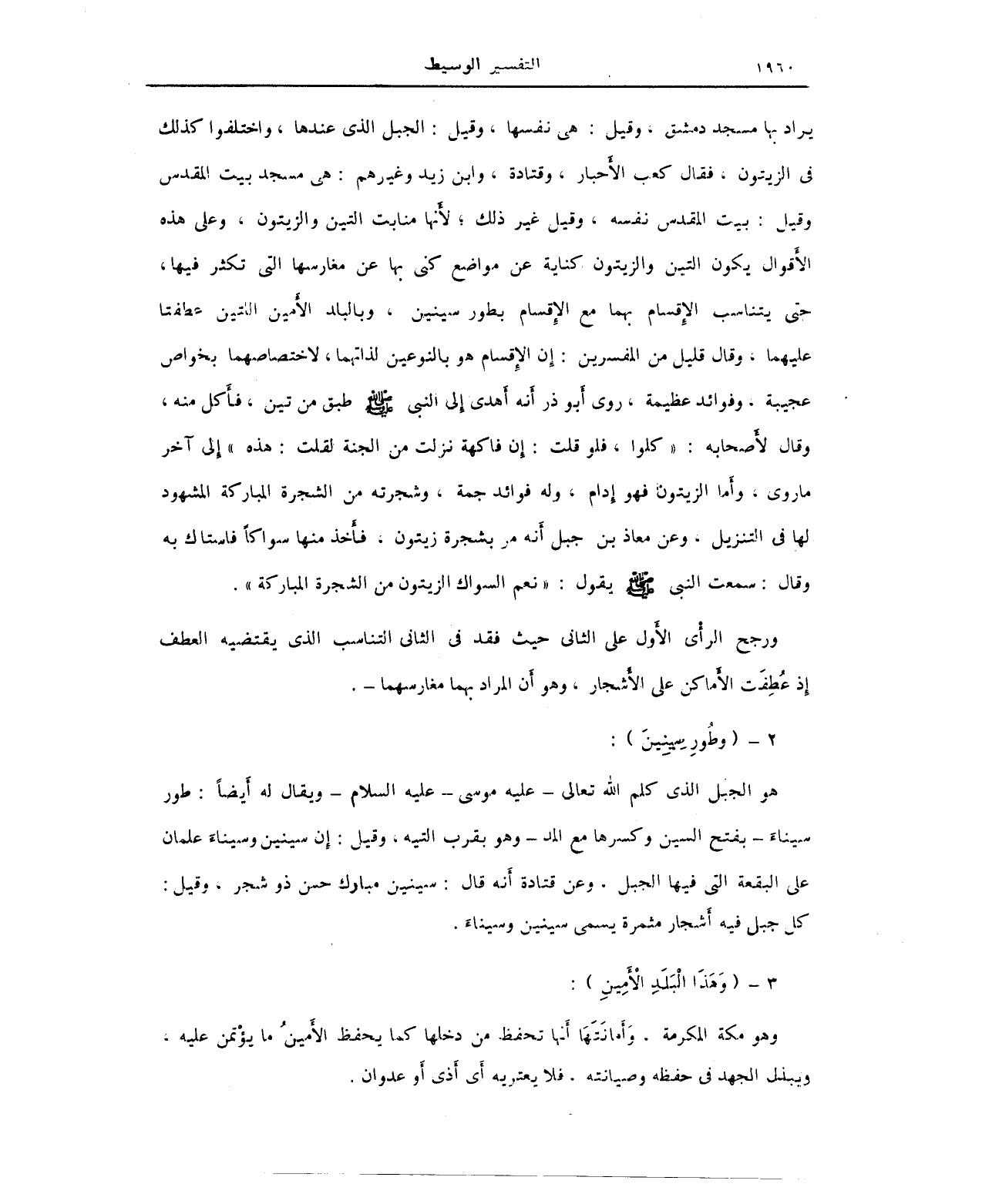 يراد بها مسجد دمشق، وقيل: هي نفسها، وقيل: الجبل الذي عندها، واختلفوا كذلك في الزيتون، فقال كعب الأَحبار، وقتادة، وابن زيد وغيرهم: هي مسجد بيت المقدس وقيل: بيت المقدس نفسه، وقيل غير ذلك؛ لأَنها منابت التين والزيتون، وعلى هذه الأَقوال يكون التين والزيتون كناية عن مواضع كنى بها عن مغارسها التي تكثر فيها، حتى يتناسب الإِقسام بهما مع الإِقسام بطور سينين، وبالبلد الأَمين اللتين عطفتا عليهما، وقال قليل من المفسرين: إِن الإِقسام هو بالنوعين لذاتهما، لاختصاصهما بخواص عجيبة، وفوائد عظيمة، روى أَبو ذر أَنه أَهدى إلى النبي صلى الله عليه وسلم طبق من تين، فأَكل منه، وقال لأَصحابه: "كلو، فلو قلت: إِن فاكهة نزلت من الجنة لقلت: هذه" إِلى آخر ما روي، وأَما الزيتون فهو إِدام، وله فوائد جمة، وشجرته من الشجرة المباركة المشهود لها في التنزيل، وعن معاذ بن جبل أَنه مر بشجرة زيتون، فأَخذ منها سواكًا فاستاك به وقال: سمعت النبي صلى الله عليه وسلم يقول: "نعم السواك الزيتون من الشجرة المباركة".