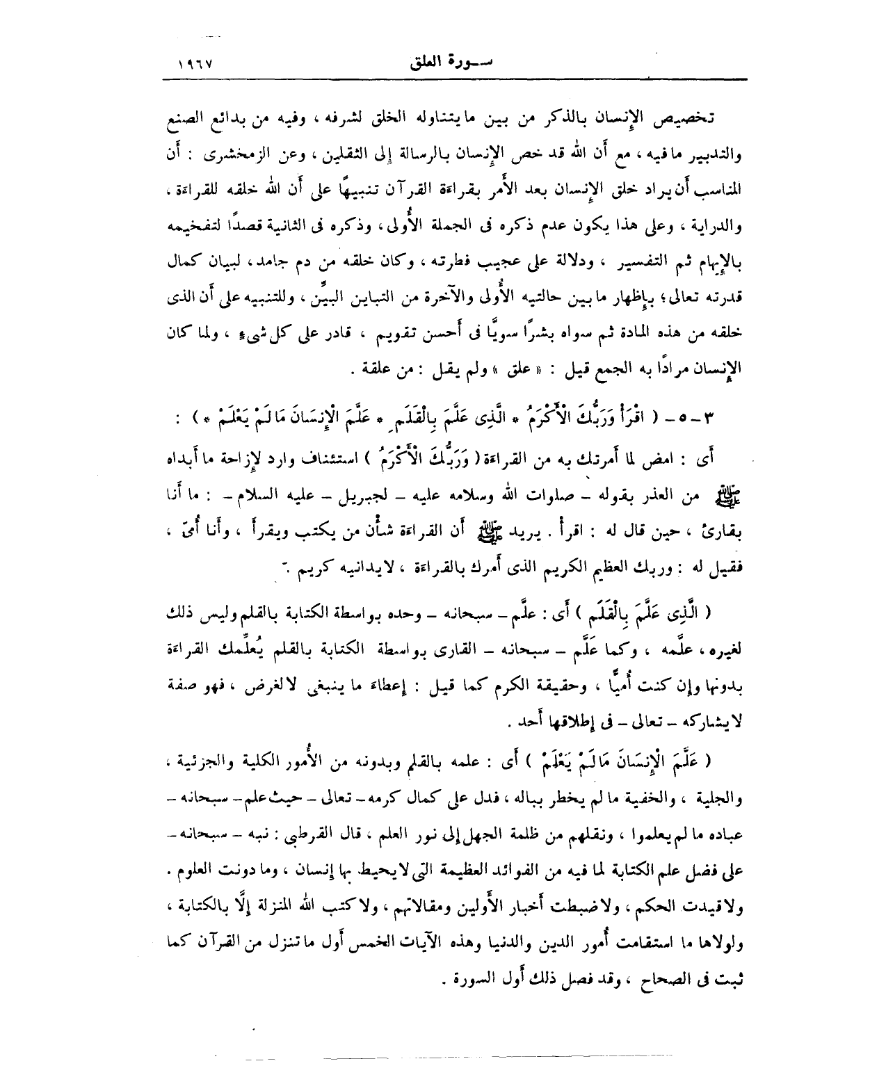 (الَّذِي عَلَّمَ بِالْقَلَمِ) أَي: علَّم -سبحانه- وحده بواسطة الكتابة بالقلم وليس ذلك لغيره، علَّمه، وكما عَلَّم -سبحانه- القاري بواسطة الكتابة بالقلم يُعلِّمك القراءَة بدونها وإِن كنت أُميًّا، وحقيقة الكرم كما قيل: إِعطاءَ ما ينبغي لا لغرض، فهو صفة لا يشاركه تعالى في إِطلاقها أَحد.