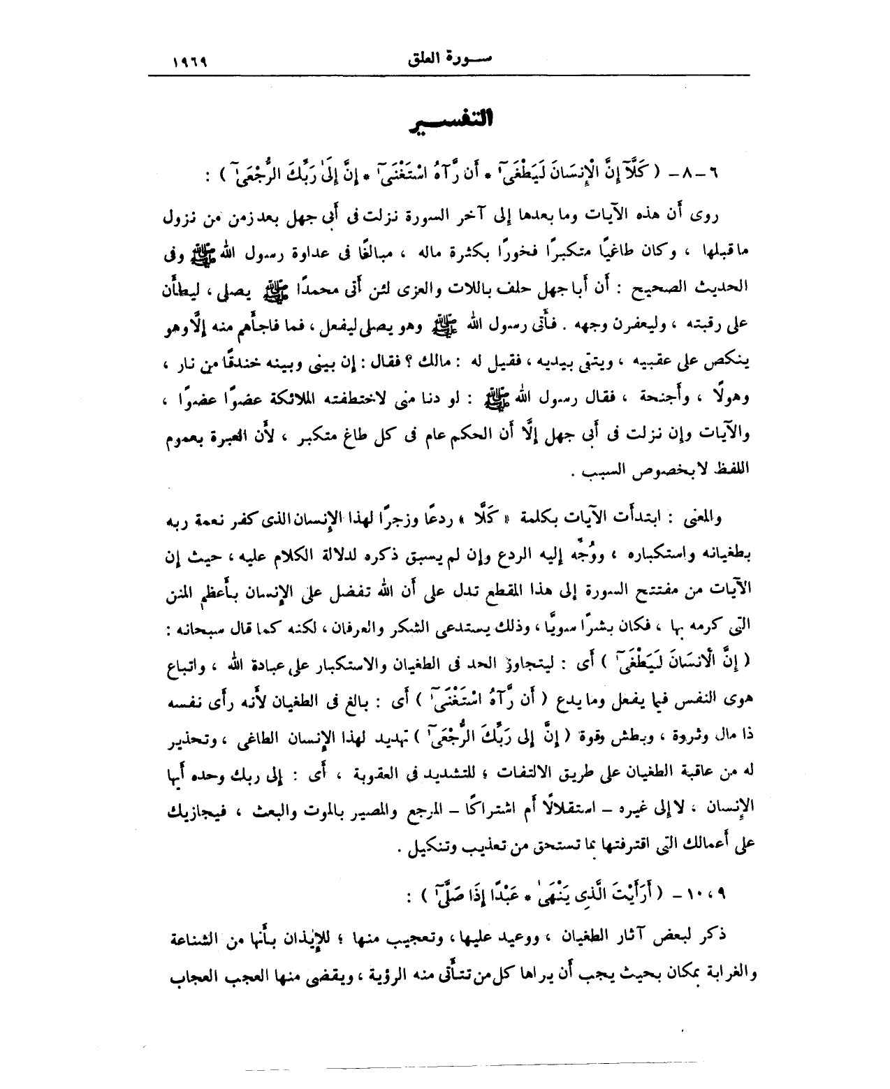 والمعنى: ابتدأَت الآيات بكلمة (كَلاَّ) ردعًا وزجرًا لهذا الإِنسان الذي كفر نعمة ربه بطغيانه واستكباره، ووُجِّه إِليه الردع وإِن لم يسبق ذكره لدلالة الكلام عليه، حيث إِن الآيات من مفتتح السورة إِلى هذا المقطع تدل على أَن الله تفضل على الإِنسان بأَعظم المنن التي كرمه بها، فكان بشرًا سويًّا، وذلك يستدعي الشكر والعرفان، لكنه كما قال سبحانه: "إِنَّ الإِنسَانَ لَيَطْغَى" أَي: ليتجاوز الحد في الطغيان والاستكبار على عبادة الله، واتباع هوى النفس فيما يفعل وما يدع (أَنْ رَآهُ اسْتَغْنَى) أَي: بالغ في الطغيان لأَنه رأَى نفسه ذا مال وثروة، وبطش قوة (إِنَّ إِلَى رَبِّكَ الرُّجْعَى) تهديد لهذا الإِنسان الطاغي، وتحذير له من عاقبة الطغيان على طريق الالتفات؛ للتشديد في العقوبة، أَي: إِلى ربك وحده أَيها الإِنسان، لا إِلى غيره -استقلالًا أَم اشتراكًا- المرجع والمصير بالموت والبعث، فيجازيك على أَعمالك التي اقترفتها بما تستحق من تعذيب وتنكيل.
