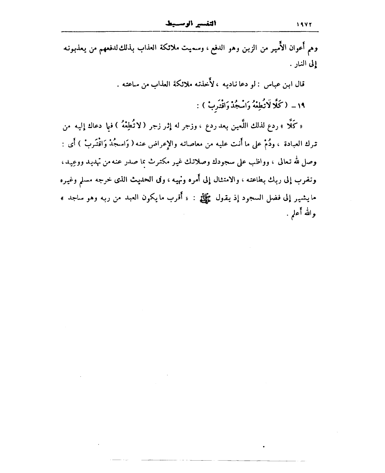 (كَلاَّ) ردع لذلك اللَّعين بعد ردع، وزجر له إِثر زجر (لا تُطِعْهُ) فيما دعاك إِليه من ترك العبادة، ودُمْ على ما أَنت عليه من معاصاته والإِعراض عنه (وَاسْجُدْ وَاقْتَرِبْ) أَي: وصل لله تعالى، وواظب على سجودك وصلاتك غير مكترث بما صدر عنه من تهديد ووعِيد، وتقرب إِلى ربك بطاعته، والامتثال إِلى أَمره ونهيه، وفي الحديث الذي خرجه مسلم وغيره ما يشير إِلى فضل السجود إِذ يقول صلى الله عليه وسلم: "أَقرب ما يكون العبد من ربه وهو ساجد" والله أَعلم.