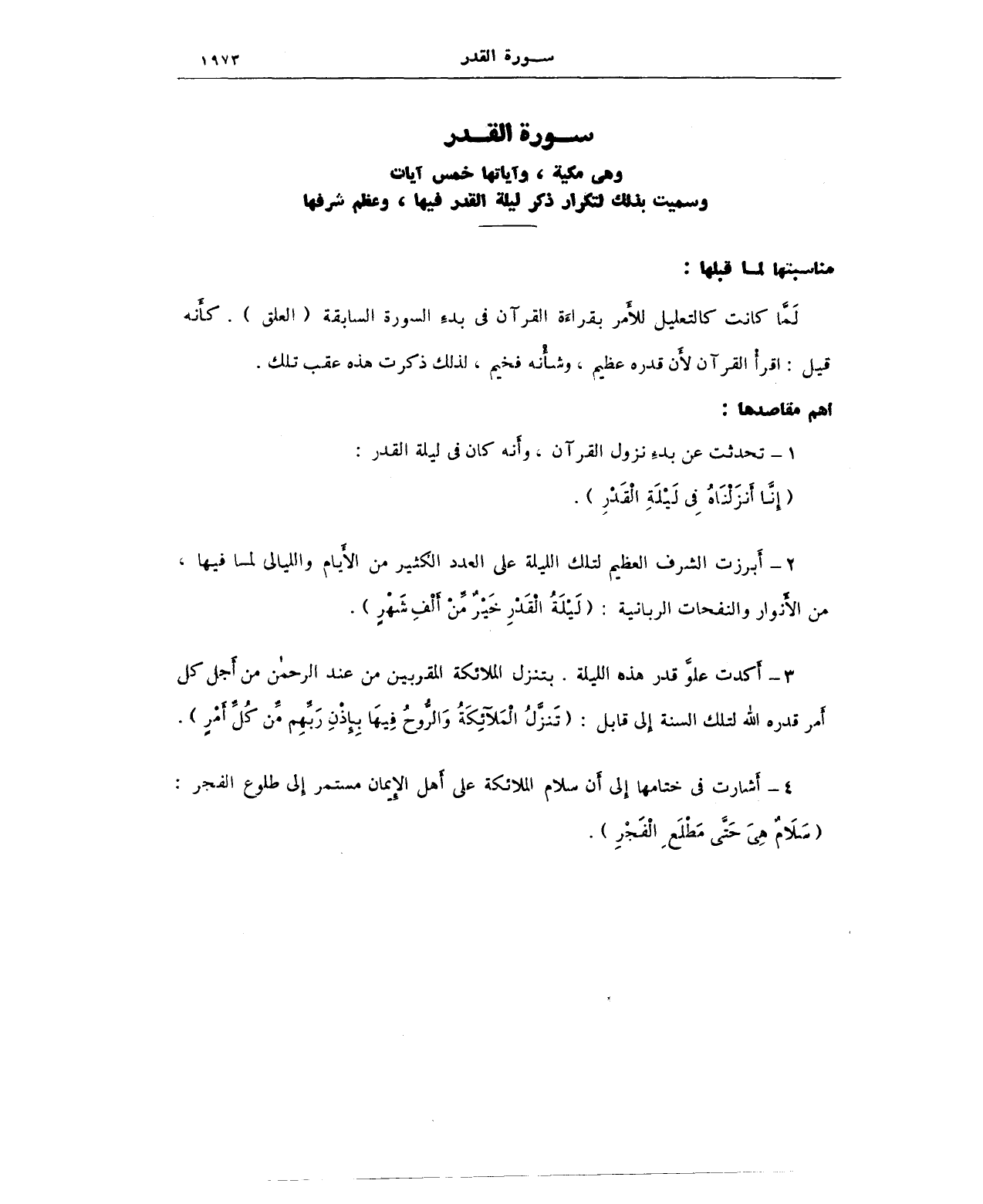 4 - أَشارت في ختامها إِلى أَن سلام الملائكة على أَهل الإِيمان مستمر إِلى طلوع الفجر: (سَلامٌ هِيَ حَتَّى مَطْلَعِ الْفَجْرِ).