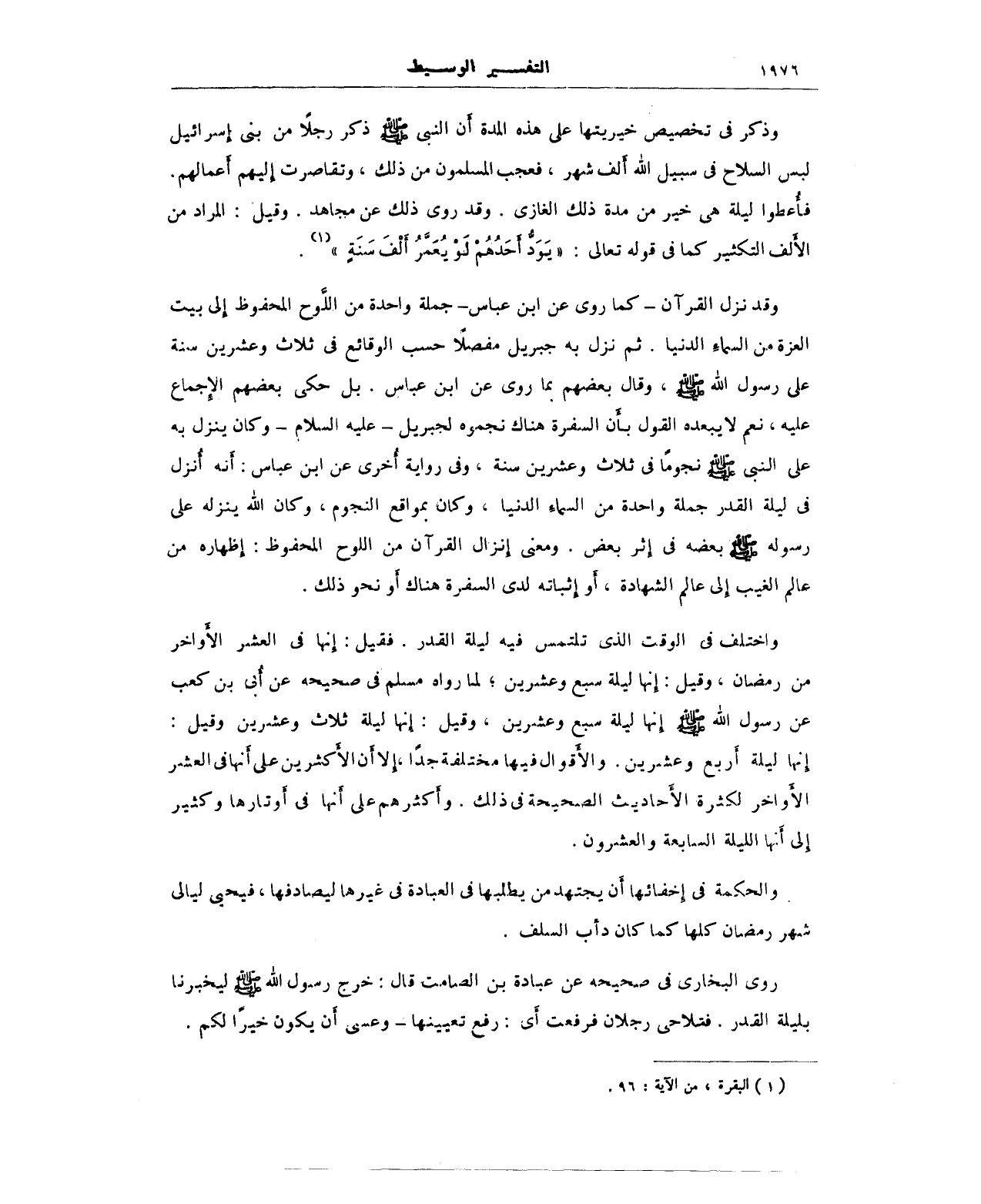 وذكر في تخصيص خيريتها على هذه المدة أَن النبي صلى الله عليه وسلم ذكر رجلًا من بني إِسرائيل لبس السلاح في سبيل الله أَلف شهر، فعجب المسلمون من ذلك، وتقاصرت إِليهم أَعمالهم. فأُعطوا ليلة هي خير من مدة ذلك الغازي. وقد روي ذلك عن مجاهد. وقيل: المراد من الأَلف التكثير كما في قوله تعالى: "يَوَدُّ أَحَدُهُمْ لَوْ يُعَمَّرُ أَلْفَ سَنَةٍ" (¬1).
