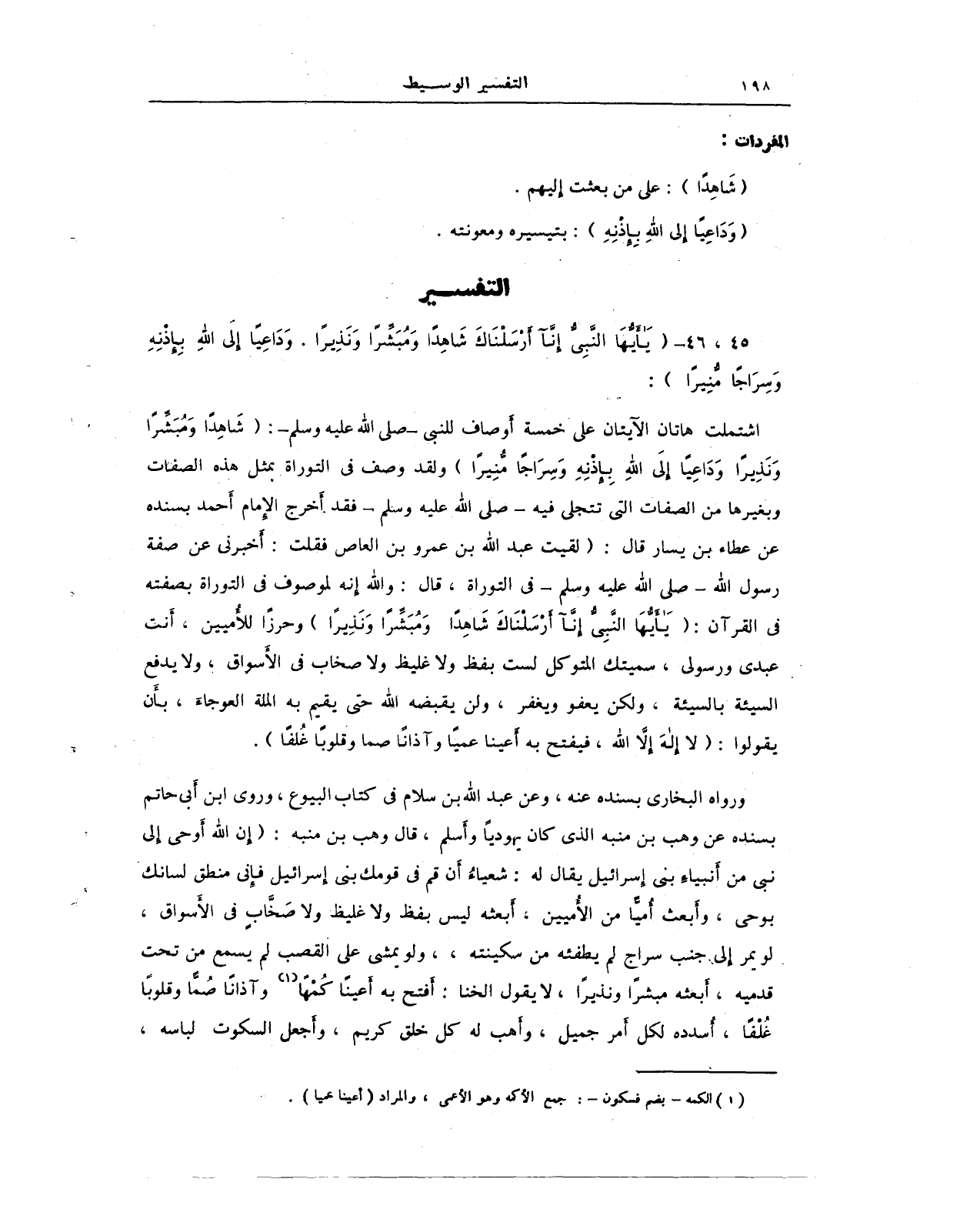 اشتملت هاتان الآيتان على خمسة أوصاف للنبي - صلى الله عليه وسلم -: {شَاهِدًا وَمُبَشِّرًا وَنَذِيرًا (45) وَدَاعِيًا إِلَى اللَّهِ بِإِذْنِهِ وَسِرَاجًا مُنِيرًا} ولقد وصف في التوراة بمثل هذه الصفات وبغيرها من الصفات التي تتجلى فيه - صلى الله عليه وسلم - فقد أخرج الإمام أحمد بسنده عن عطاء بن يسار قال: (لقيت عبد الله بن عمرو بن العاص فقلت: أَخبرني عن صفة رسول الله - صلى الله عليه وسلم - في التوراة، قال: والله إنه لموصوف في التوراة بصفته في القرآن: {يَا أَيُّهَا النَّبِيُّ إِنَّا أَرْسَلْنَاكَ شَاهِدًا وَمُبَشِّرًا وَنَذِيرًا} وحرزًا للأُميين، أَنت عبدي ورسولى، سميتك المتوكل لست بفظ ولا غليظ ولا صخاب في الأَسواق، ولا يدفع السيئة بالسيئة، ولكن يعفو ويغفر، ولن يقبضه الله حتى يقيم به الملة العوجاء، بأَن يقولوا: (لا إلهَ إلاَّ الله، فيفتح به أعينا عميًا وآذانًا صما وقلوبًا غُلفًا).
