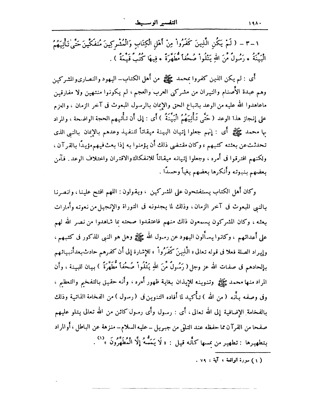 وكان أَهل الكتاب يستفتحون على المشركين، ويقولون: اللهم افتح علينا، وانصرنا بالنبي المبعوث في آخر الزمان، وذلك لما يجدونه في التوراة والإِنجيل من نعوته وأَمارات بعثه، وكان المشركون يسمعون ذلك منهم فاعتقدوا صحته بما شاهدوا من نصر الله لهم على أَعدائهم، وكانوا يسألون اليهود عن رسول الله صلى الله عليه وسلم وهل هو النبي المذكور في كتبهم، وإِيراد الصلة فعلا في قوله تعالى "الَّذِينَ كَفَرُوا" للإِشارة إِلى أَن كفرهم حادث بعد أَنبيائهم بإِلحادهم في صفات الله عز وجل (رَسُولٌ مِنْ اللَّهِ يَتْلُوا صُحُفًا مُطَهَّرَةً) بيان للبينة، وأَن المراد منها محمد صلى الله عليه وسلم وتنوينه للإِيذان بغاية ظهور أَمره، وأَنه حقيق بالتفخيم والتعظيم، وفي وصفه بأَنه (من الله) تأْكيد لما أَفاده التنوين في (رسول) من الفخامة الذاتية وذلك بالفخامة الإضافية إِلى الله تعالى، أَي: رسول وأَي رسول كائن من الله تعالى يتلو عليهم صفحا من القرآن مما حفظه عند التلقي من جبريل - عليه السلام - منزهة عن الباطل، أَو المراد بتطهيرها: تطهير من يمسها كأَنه قيل: "لا يَمَسُّهُ إِلاَّ الْمُطَهَّرُونَ" (¬1).
