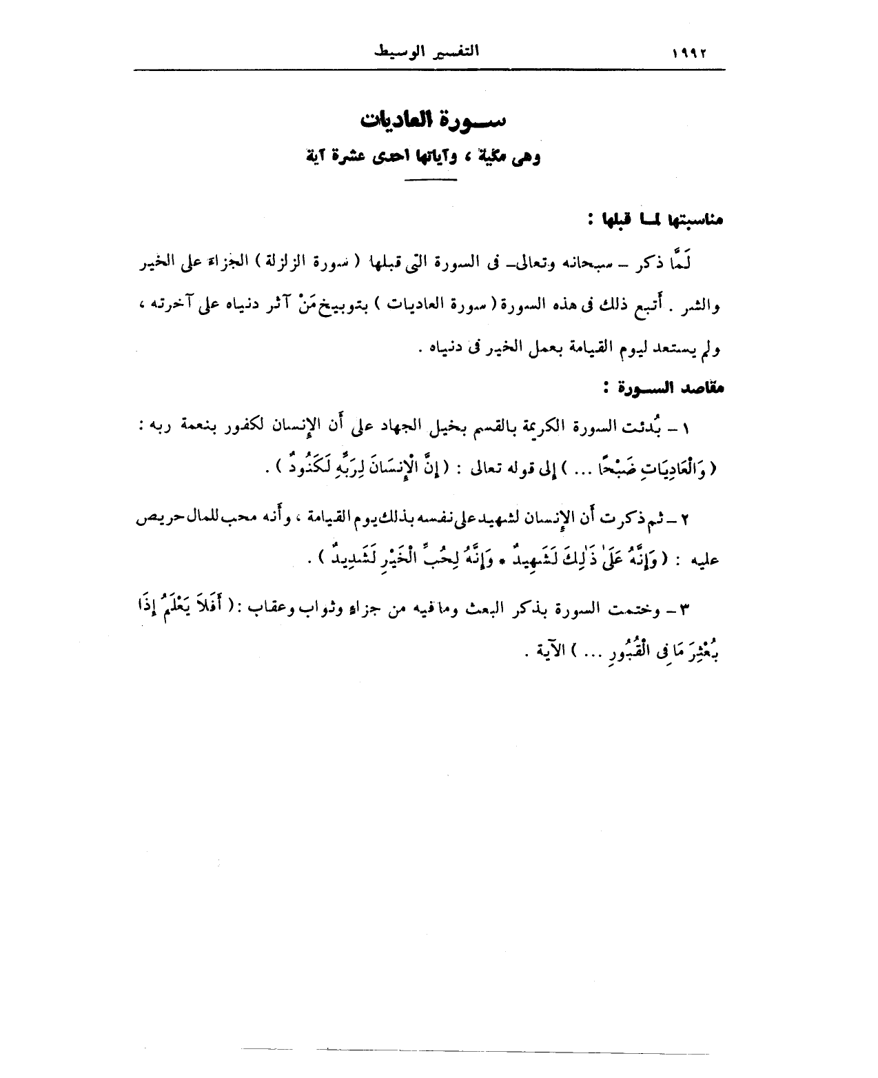 1 - بُدئت السورة الكريمة بالقسم بخيل الجهاد على أَن الإِنسان لكفور بنعمة ربه: (وَالْعَادِيَاتِ ضَبْحًا .. ) إلى قوله تعالى: (إِنَّ الإِنسَانَ لِرَبِّهِ لَكَنُودٌ).