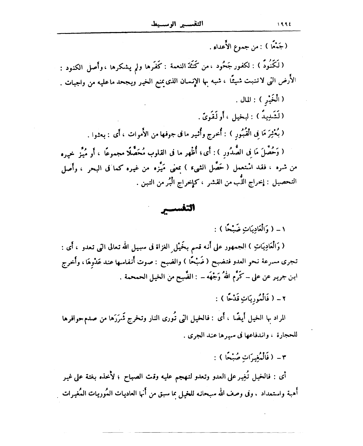(وَالْعَادِيَاتِ) الجمهور على أَنه قسم بخَيْلِ الغزاة في سبيل الله تعالى التي تعدو، أَي: تجري مسرعة نحو العدو فتضبح (ضَبْحًا) والضبح: صوت أَنفاسها عند عَدْوِهَا، وأخرج ابن جرير عن على -كرم اللهُ وَجْهَه-: الضَّبح من الخيل الحمحمة.