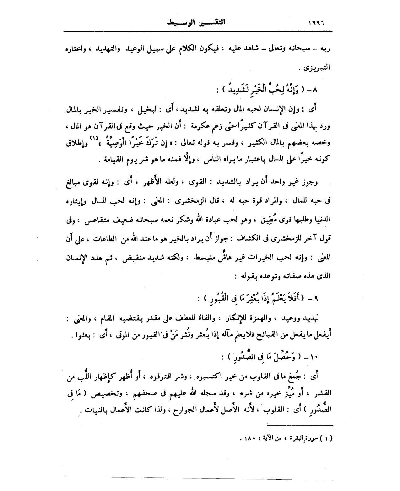 أَي: وإِن الإِنسان لحبه المال وتعلقه به لشديد أَي: لبخيل، وتفسير الخير بالمال ورد بهذا المعنى في القرآن كثيرًا حتى زعم عكرمة: أَن الخير حيث وقع في القرآن هو المال، وخصه بعضهم بالمال الكثير، وفسر به قوله تعالى: "إِن تَرَكَ خَيْرًا الْوَصِيَّةُ" (¬1) وإطلاق كونه خيرًا على المال باعتبار ما يراه الناس، وإلَّا فمنه ما هو شر يوم القيامة.