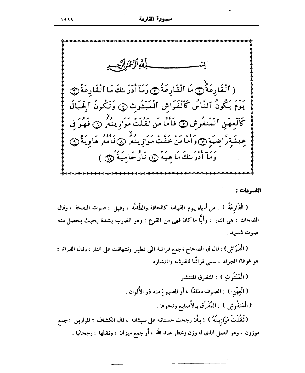 (الْقَارِعَةُ): من أَسماء يوم القيامة كالحاقة والطَّامَّة، وقيل: صوت النفخة، وقال الضحاك: هي النار، وأيًّا ما كان فهي من القرع: وهو الضرب بشدة بحيث يحصل منه صوت شديد.