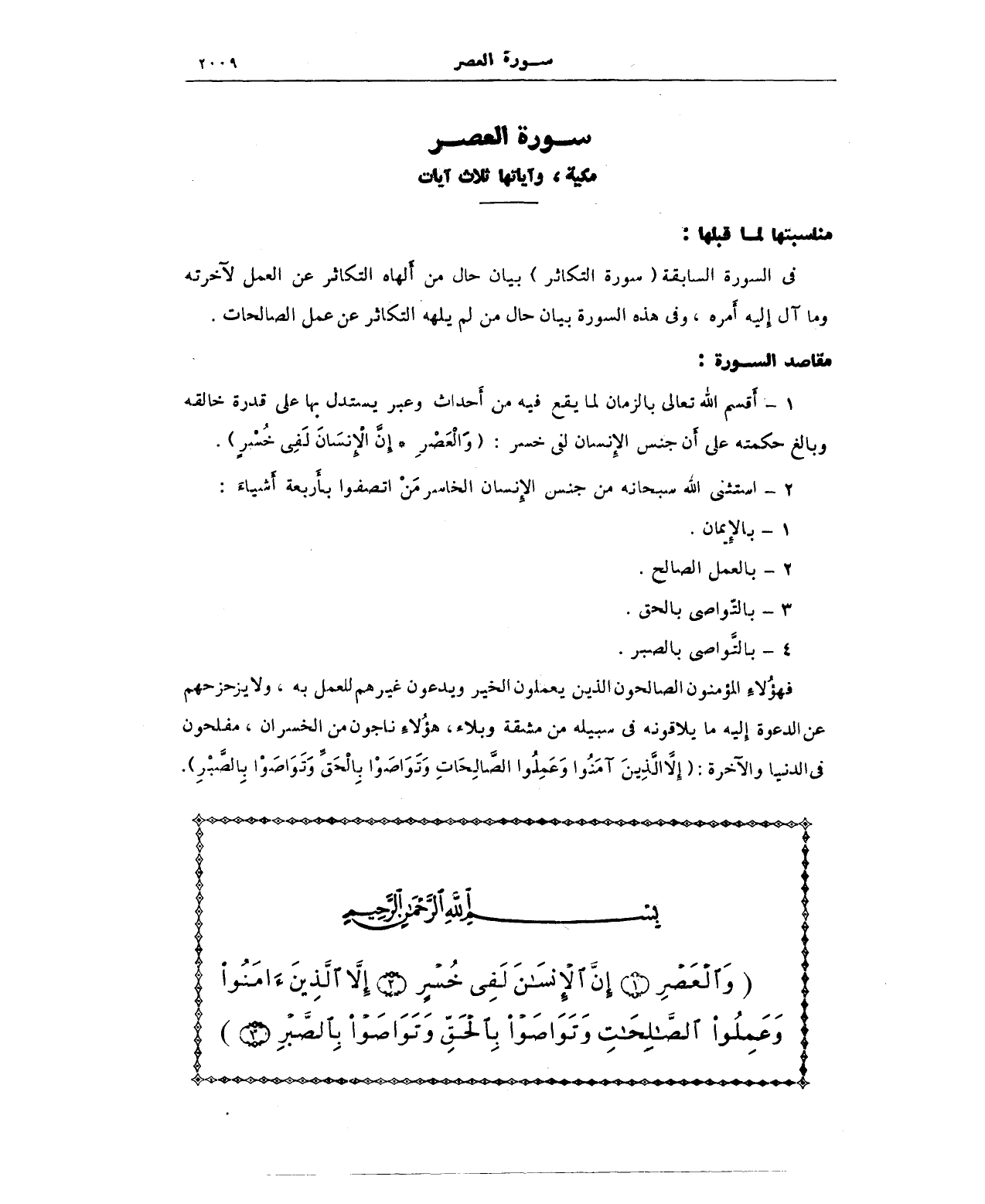 (وَالْعَصْرِ (1) إِنَّ الإِنسَانَ لَفِي خُسْرٍ (2) إِنَّ إِلاَّ الَّذِينَ آمَنُوا وَعَمِلُوا الصَّالِحَاتِ وَتَوَاصَوْا بِالْحَقِّ وَتَوَاصَوْا بِالصَّبْرِ (3))