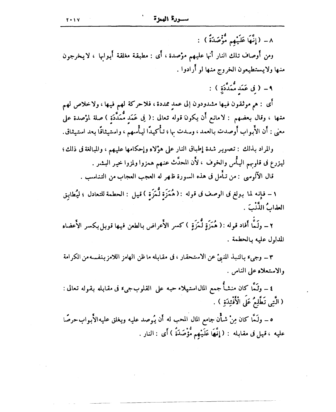 5 - ولَمَّا كان مِنْ شأْن جامع المال المحب له أن يُوصد عليه ويغلق عليه الأَبواب حرصًا عليه، قيل في مقابلة: (إِنَّها عَلَيْهِم مُّؤْصَدَةٌ) أَي: النار.