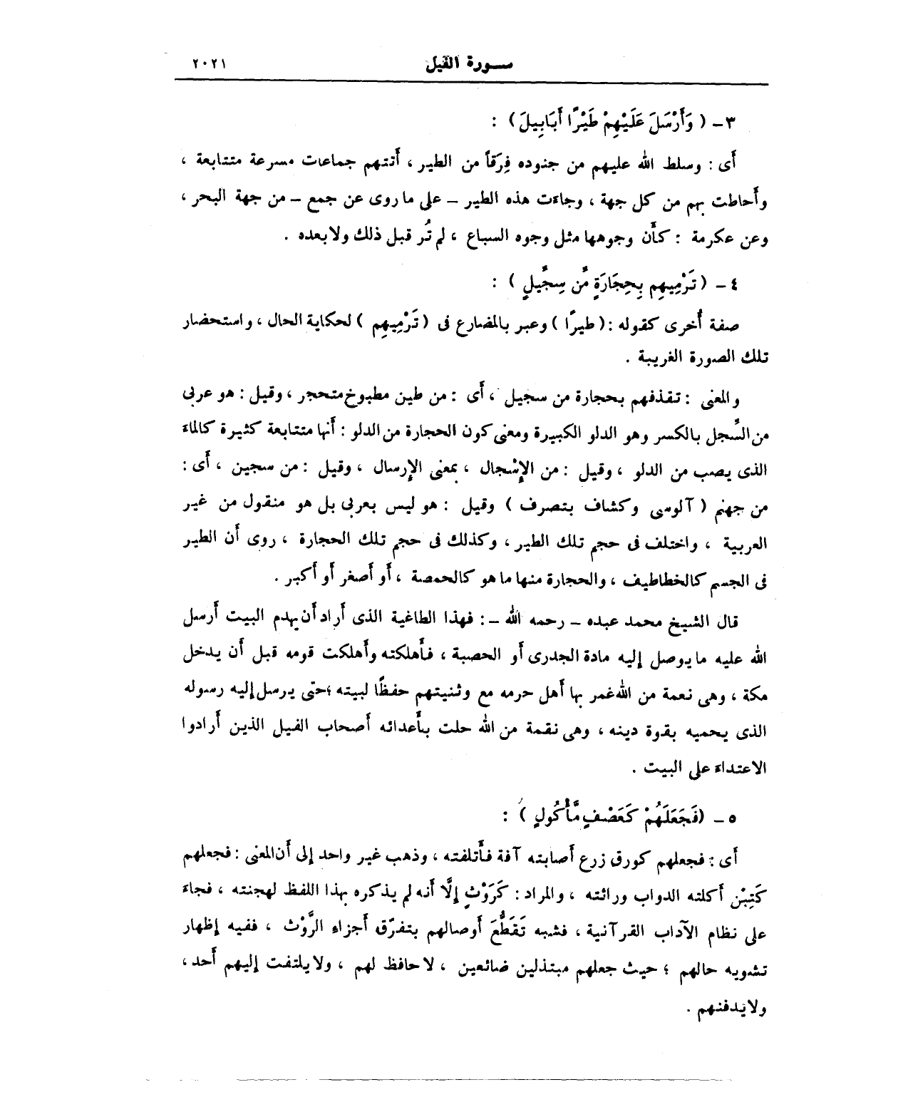 قال الشيخ محمد عبده - رحمة الله -: فهذا الطاغية الذي أراد أن يهدم البيت أرسل الله عليه ما يوصل إليه مادة الجدري أَو الحصبة، فأَهلكته وأَهلكت قومه قبل أن يدخل مكة، وهي نعمة من الله غمر بها أَهل حرمه مع وثنيتهم حفظًا لبيته؛ حتى يرسل إليه رسوله الذي يحميه بقوة دينه، وهي نقمة من الله حلت بأعدائه أَصحاب الفيل الذين أرادوا الاعتداء على البيت.