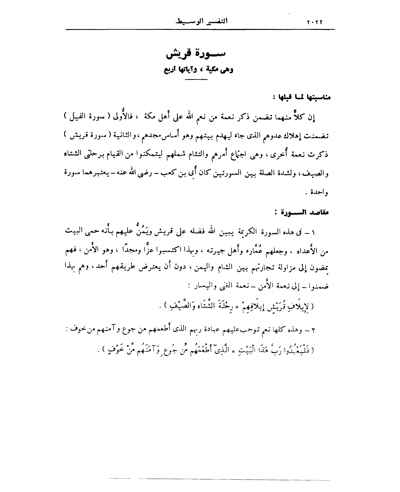 1 - في هذه السورة الكريمة يبين الله فضله على قريش ويَمُنُّ عليهم بأَنه حمى البيت من الأَعداءِ، وجعلهم عُمَّاره وأَهل جيرته، وبهذا اكتسبوا عزًّا ومجدًا، وهو الأَمن، فهم يمضون إلى مزاولة تجارتهم بين الشام واليمن، دون أَن يعترض طريقهم أَحد، وهم بهذا ضمنوا -إلى نعمة الأَمن- نعمة الغنى واليسار: