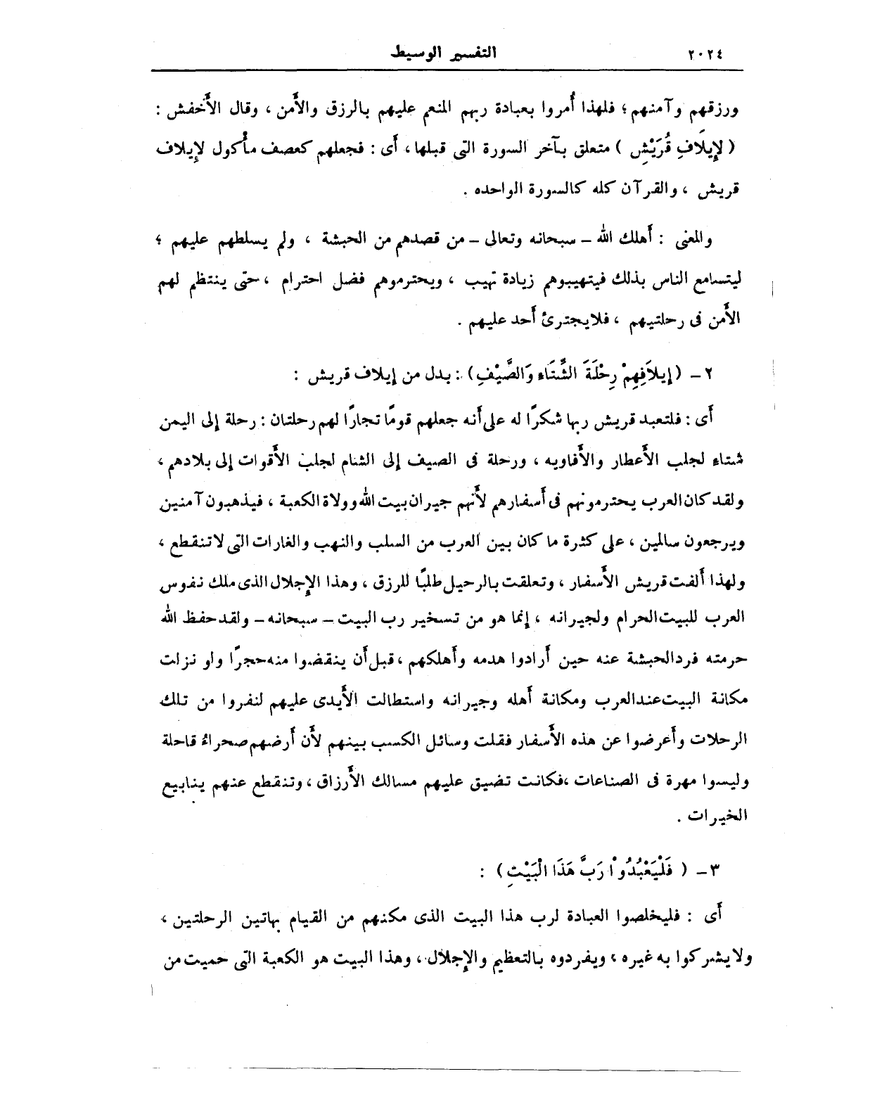 أي: فلتعبد قريش ربها شكرًا له على أَنه جعلهم قومًا تجارًا لهم رحلتان: رحلة إلى اليمن شتاءٍ لجلب الأَعطار والأَفاويه، ورحلة في الصيف إلى الشام لجلب الأَقوات إِلى بلادهم، ولقد كان العرب يحترمونهم في أَسفارهم لأنهم جيران بيت الله وولاة الكعبة، فيذهبون آمنين ويرجعون سالمين، على كثرة ما كان بين العرب من السلب والنهب والغارات التي لا تنقطع، ولهذا ألفت قريش الأَسفار، وتعلقت بالرحيل طلبًا للرزق، وهذا الإجلال الذي ملك نفوس العرب للبيت الحرام ولجيرانه، إنما هو من تسخير رب البيت سبحانه ولقد حفظ الله حرمته فرد الحبشة عنه حين أَرادوا هدمه وأَهلكهم، قبل أَن ينقضوا منه حجرًا ولو نزلت مكانة البيت عند العرب ومكانة أهله وجيرانه، واستطالت الأَيدي عليهم لنفروا من تلك الرحلات وأَعرضوا عن هذه الأَسفار فقلت وسائل الكسب بينهم لأن أرضهم صحراءُ قاحلة وليسوا مهرة في الصناعات، فكانت تضيق عليهم مسالك الأَرزاق، وتنقطع عنهم ينابيع الخيرات.