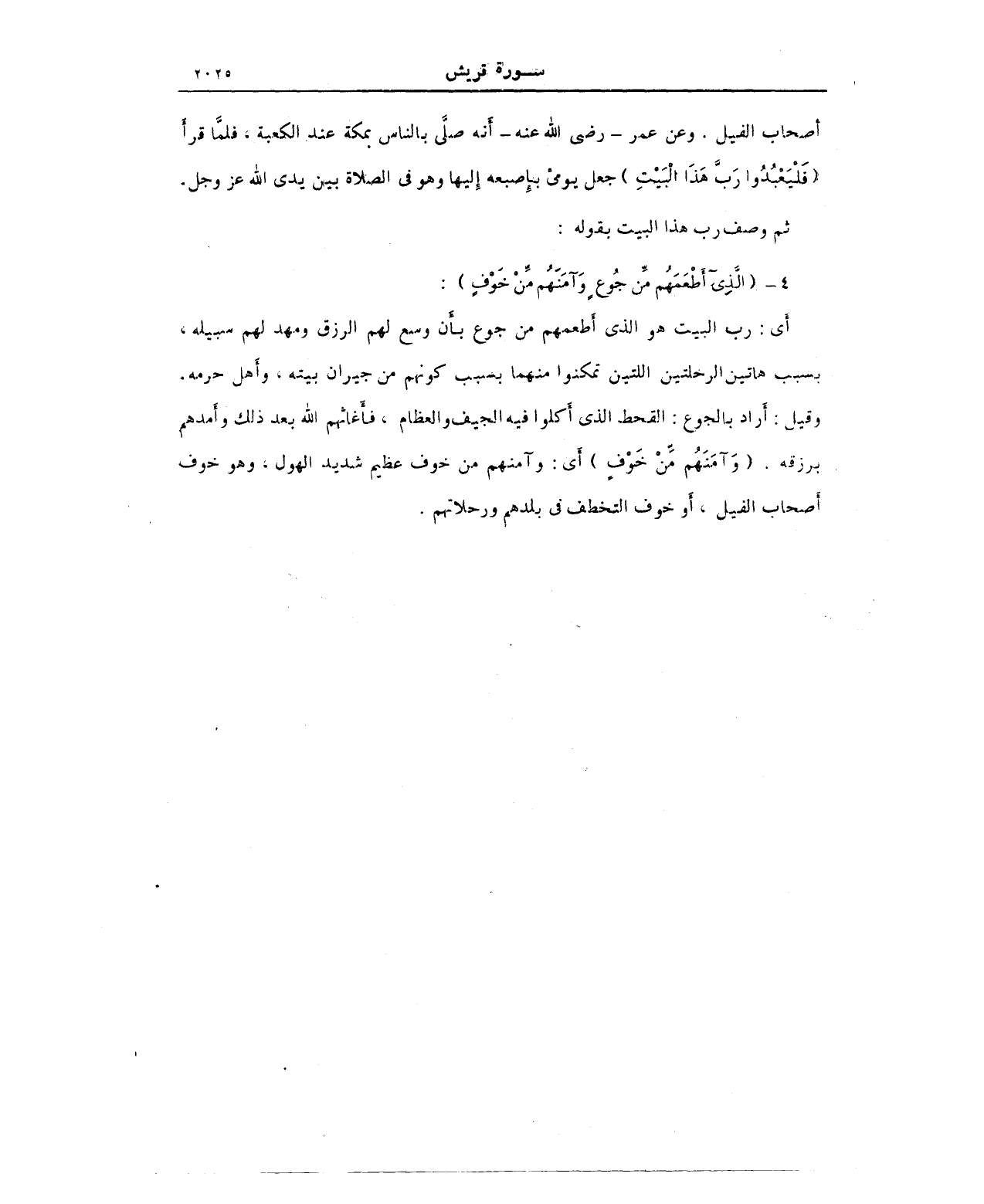 أصحاب الفيل. وعن عمر - رضي الله عنه- أنه صلَّى بالناس بمكة عند الكعبة، فلما قرأ (فَلْيَعْبُدُوا رَبَّ هَذَا الْبَيْتِ) جعل يومئ بإصبعه إِليها وهو في الصلاة بين يدي الله عز وجل.