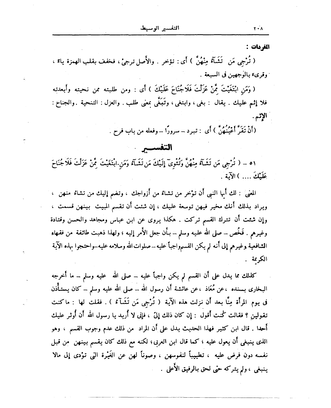 كذلك مما يدل على أن القسم لم يكن واجبًا عليه - صلى الله عليه وسلم - ما أَخرجه البخاري بسنده، عن مُعَاذ، عن عائشة أَن رسول الله - صلى الله عليه وسلم - كان يستأْذن في يوم المرأَة مِنَّا بعد أن نزلت هذه الآية {تُرْجِي مَنْ تَشَاءُ}. فقلت لها: ما كنت تقولين؟ فقالت كنت أقول: إن كان ذلك إليّ، فإني لا أُريد يا رسول الله أن أُوثر عليك أَحدا. قال ابن كثير فهذا الحديث يدل على أن المراد من ذلك عدم وجوب القسم، وهو الذي ينبغي أَن يعول عليه؛ بهما قال ابن العربي؛ لكنه مع ذلك كان يقسم بينهن من قبل نفسه دون فرض عليه، تطييبًا لنفوسهن، وصونًا لهن عن الغَيْرة التي تؤدي إلى ما لا ينبغي، ولم يتركه حتى لحق بالرفيق الأَعلى.