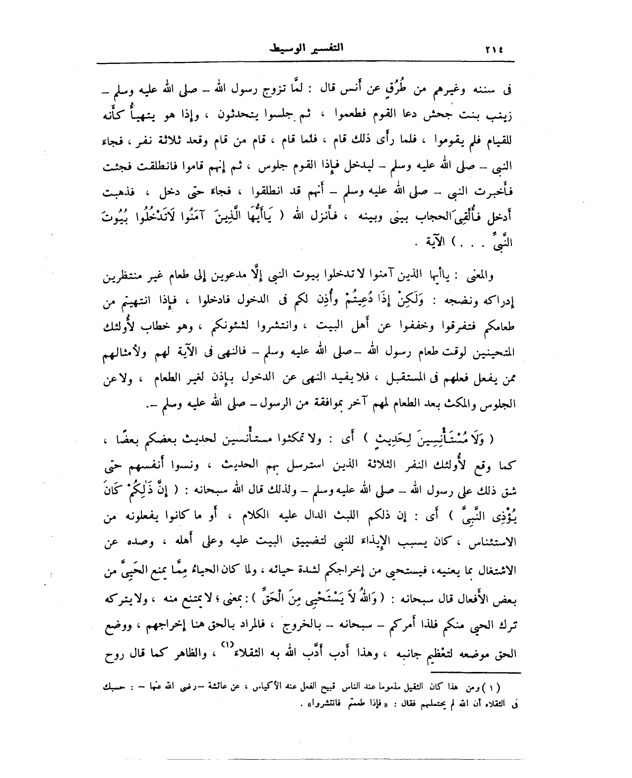 في سننه وغيرهم من طُرُقٍ عن أنس قال: لمَّا تزوج رسول الله - صلى الله عليه وسلم - زينب بنت جحش دعا القوم فطعموا، ثم جلسوا يتحدثون، وإذا هو يتهيأُ كأَنه للقيام فلم يقوموا، فلما رأى ذلك قام، فلما قام، قام من قام وقعد ثلاثة نفر، فجاءَ النبي - صلى الله عليه وسلم - ليدخل فإذا القوم جلوس، ثم إنهم قاموا فانطلقت فجئت فأخبرت النبي - صلى الله عليه وسلم - أَنهم قد انطلقوا، فجاء حتى دخل، فذهبت أدخل فأُلْقِيَ الحجاب بيني وبينه، فأَنزل الله {يَا أَيُّهَا الَّذِينَ آمَنُوا لَا تَدْخُلُوا بُيُوتَ النَّبِيِّ ... } الآية.
