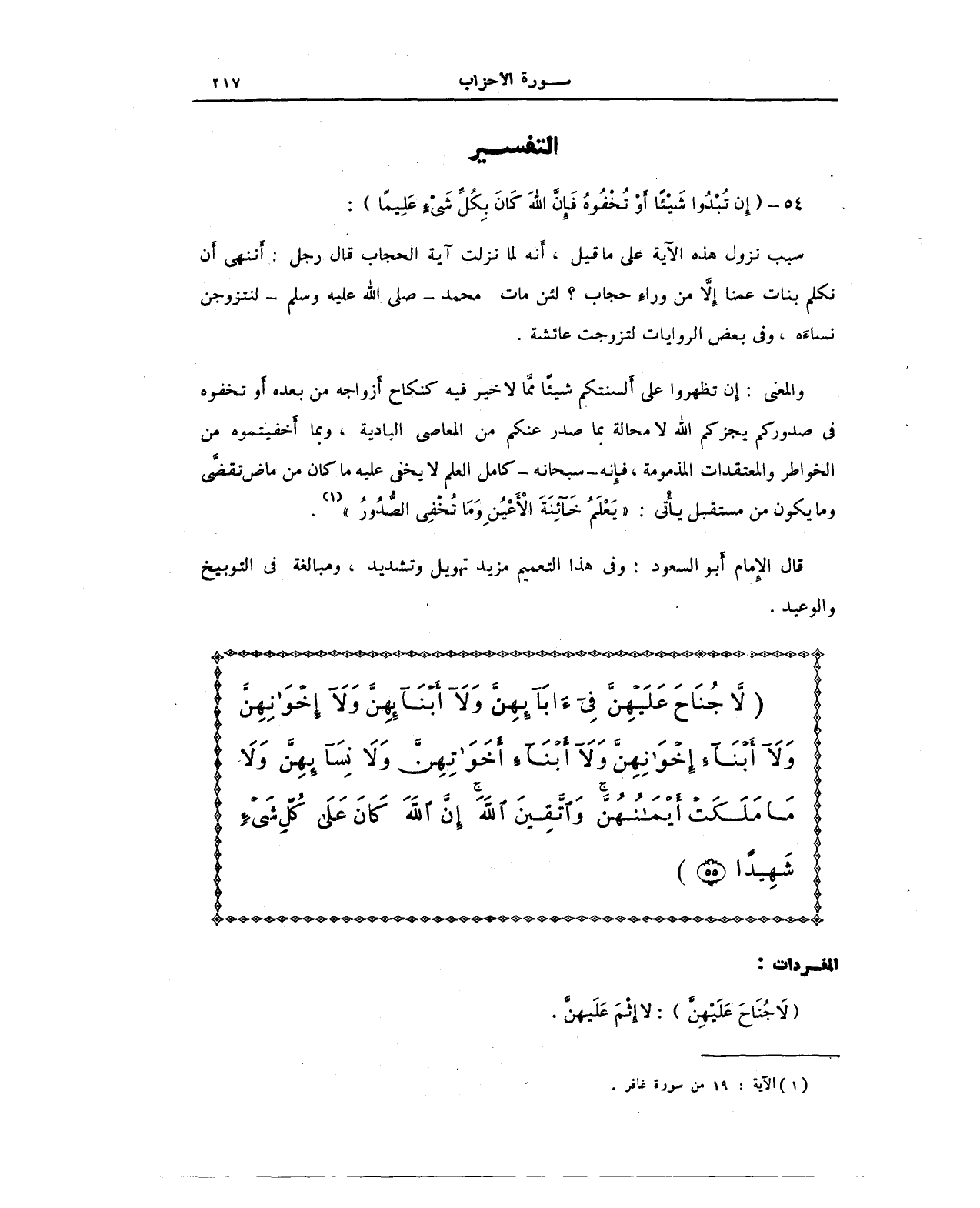 {لَا جُنَاحَ عَلَيْهِنَّ فِي آبَائِهِنَّ وَلَا أَبْنَائِهِنَّ وَلَا إِخْوَانِهِنَّ وَلَا أَبْنَاءِ إِخْوَانِهِنَّ وَلَا أَبْنَاءِ أَخَوَاتِهِنَّ وَلَا نِسَائِهِنَّ وَلَا مَا مَلَكَتْ أَيْمَانُهُنَّ وَاتَّقِينَ اللَّهَ إِنَّ اللَّهَ كَانَ عَلَى كُلِّ شَيْءٍ شَهِيدًا (55)}