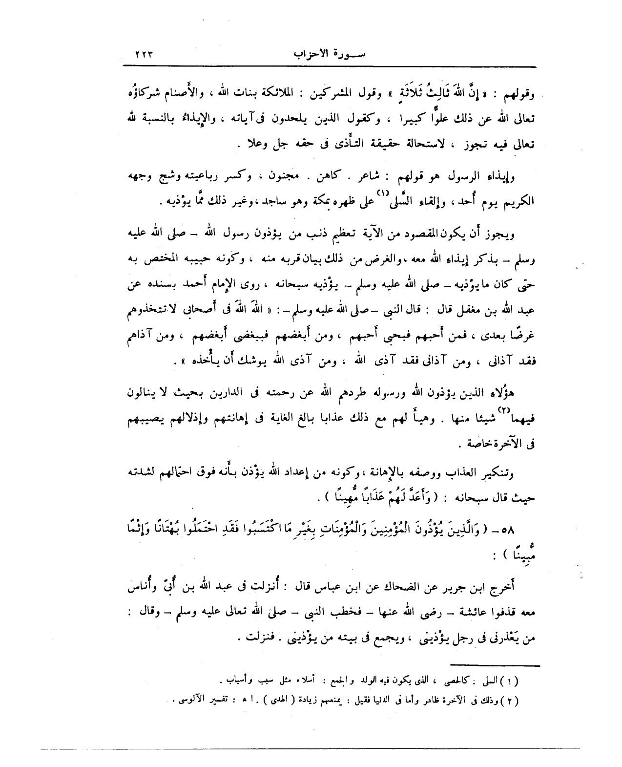 وإيذاءِ الرسول هو قولهم: شاعر. كاهن. مجنون، وكسر رباعيته وشج وجهه الكريم يوم أُحد، وإلقاء السَّلى (¬1) على ظهره بمكة وهو ساجد، وغير ذلك ممَّا يؤذيه.