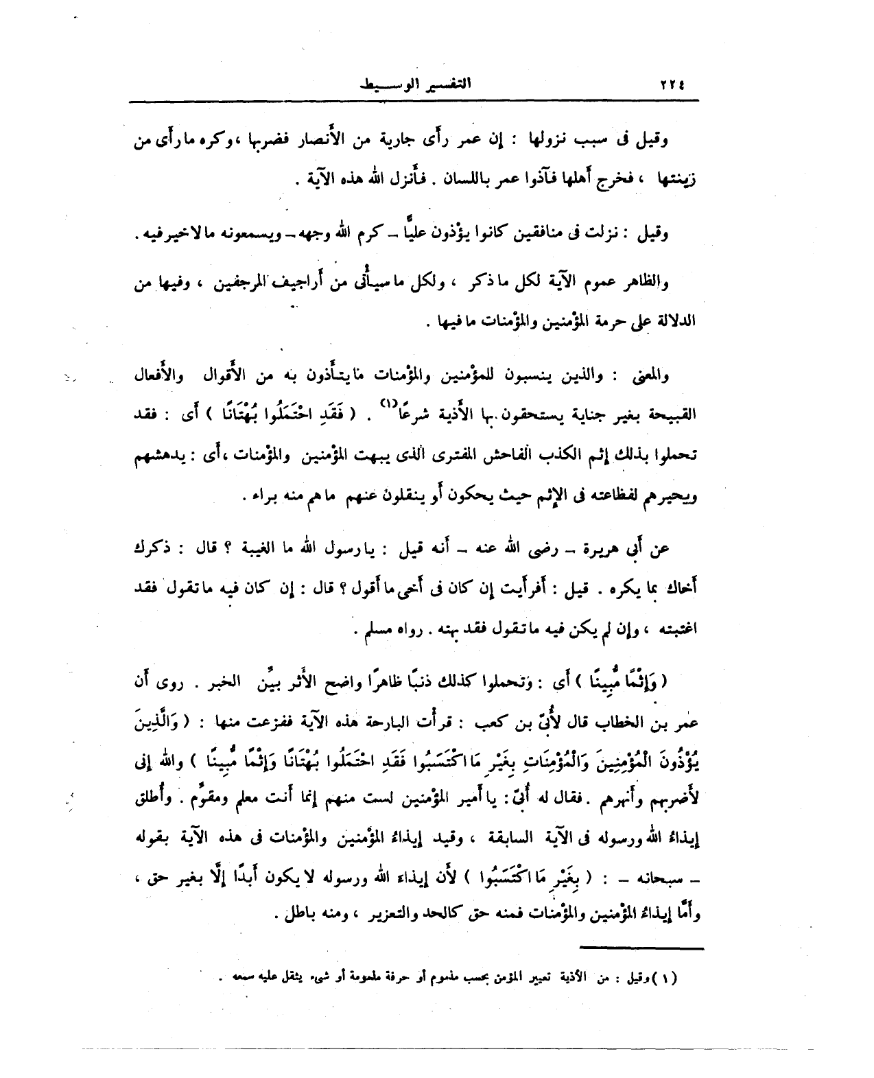{وَإِثْمًا مُبِينًا} أي: وتحملوا كذلك ذنبًا ظاهرًا واضح الأَثر بيِّن الخبر. روي أَن عمر بن الخطاب قال لأُبيّ بن كعب: قرأْت البارحة هذه الآية ففزعت منها: {وَالَّذِينَ يُؤْذُونَ الْمُؤْمِنِينَ وَالْمُؤْمِنَاتِ بِغَيْرِ مَا اكْتَسَبُوا فَقَدِ احْتَمَلُوا بُهْتَانًا وَإِثْمًا مُبِينًا} والله إني لأَضربهم وأَنهرهم. فقال له. أُبيّ: يا أمير المؤمنين لست منهم إنما أنت معلم ومقوِّم. وأُطلق إيذاءُ الله ورسوله في الآية السابقة، وقيد إيذاءُ المؤمنين والمؤْمنات في هذه الآية بقوله - سبحانه -: {بِغَيْرِ مَا اكْتَسَبُوا} لأَن إِيذاءَ الله ورسوله لا يكون أبدًا إلاَّ بغير حق، وأَمَّا إِيذاءُ المؤْمنين والمؤْمنات فمنه حق كالحد والتعزير، ومنه باطل.