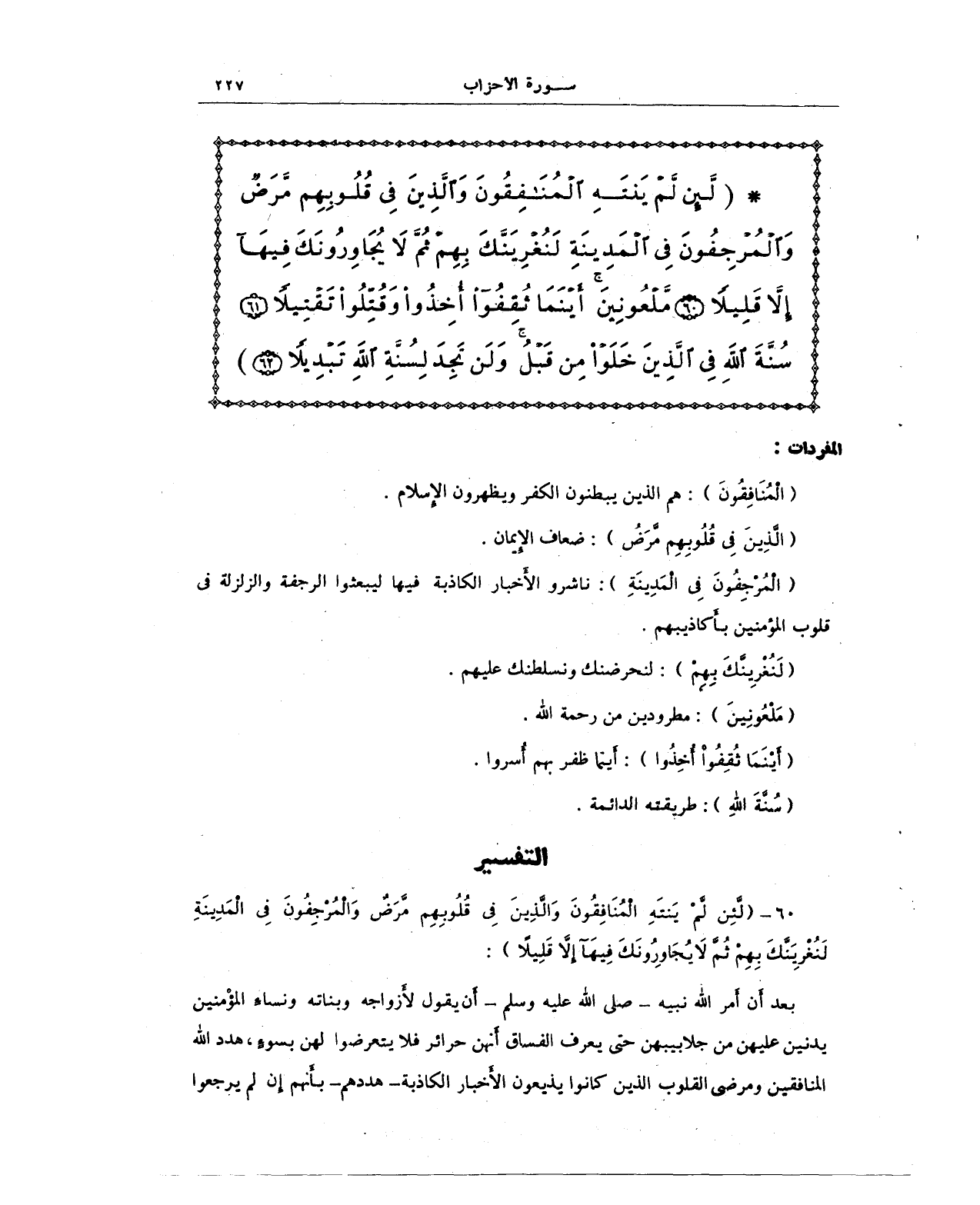 * {لَئِنْ لَمْ يَنْتَهِ الْمُنَافِقُونَ وَالَّذِينَ فِي قُلُوبِهِمْ مَرَضٌ وَالْمُرْجِفُونَ فِي الْمَدِينَةِ لَنُغْرِيَنَّكَ بِهِمْ ثُمَّ لَا يُجَاوِرُونَكَ فِيهَا إِلَّا قَلِيلًا (60) مَلْعُونِينَ أَيْنَمَا ثُقِفُوا أُخِذُوا وَقُتِّلُوا تَقْتِيلًا (61) سُنَّةَ اللَّهِ فِي الَّذِينَ خَلَوْا مِنْ قَبْلُ وَلَنْ تَجِدَ لِسُنَّةِ اللَّهِ تَبْدِيلًا (62)}